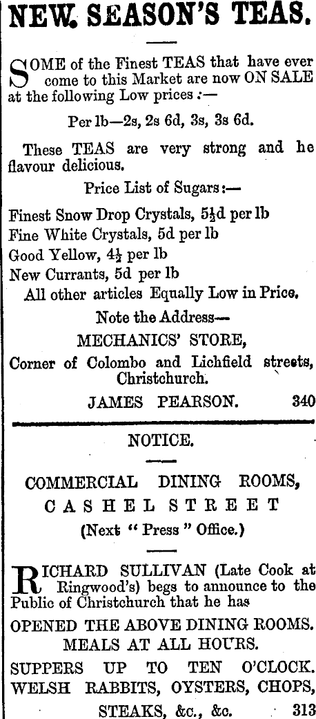 NEW SEASON’S TEAS. SOME of the Finest TEAS that have ever come to this Market are now ON SALE at the following Low prices Per lb—2s, 2s 6d, 3s, 3s fid. These TEAS are very strong and he flavour delicious. Price List of Sugars;— Finest Snow Drop Crystals, 5Jd per lb Fine White Crystals, fid per lb Good Yellow, 4£ per lb New Currants, 5d per lb All other articles Equally Low in Price, Note the Address— MECHANICS’ STORE, Corner of Colombo and Lichfield streets, Christchurch. JAMES PEARSON. 340 NOTICE. COMMERCIAL DINING ROOMS, CASHEL STREET (Next “ Press ” Office.) Richard sullivan (Late Cook at Ringwood’s) begs to announce to the Public of Christchurch that he has OPENED THE ABOVE DINING ROOMS. MEALS AT ALL HOURS. SUPPERS UP TO TEN O’CLOCK. WELSH RABBITS, OYSTERS, CHOPS, STEAKS, &c., &c. 313