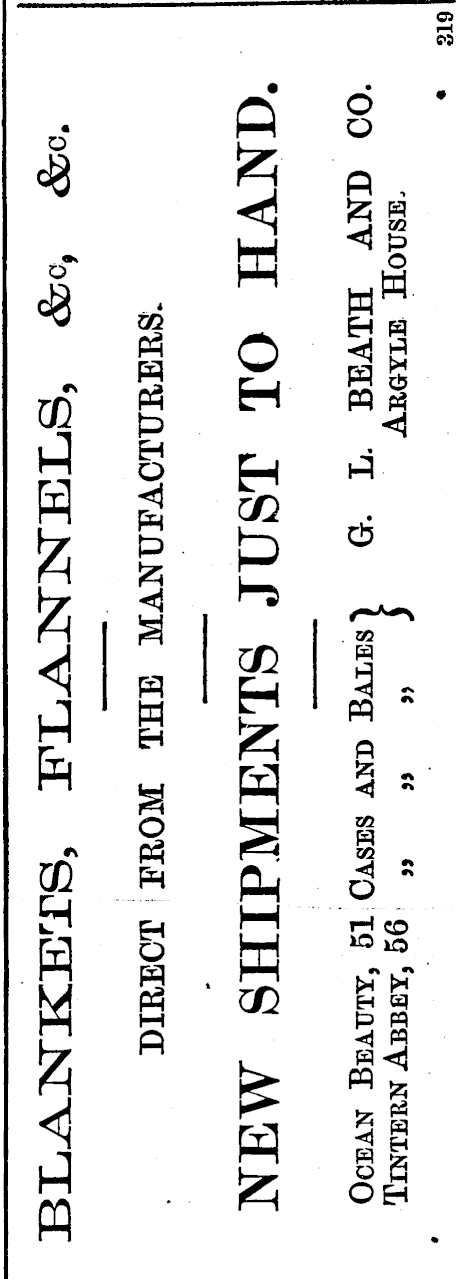 BLANKETS, FLANNELS, &c. DIRECT PROM THE MANUFACTURERS. NEW SHIPMENTS JUST TO HAND. Ocean Beauty, 51 Oases and Bales') G. L. BEATH AND CO. Tintern Abbey, 56 „ „ „ J Argyle House.