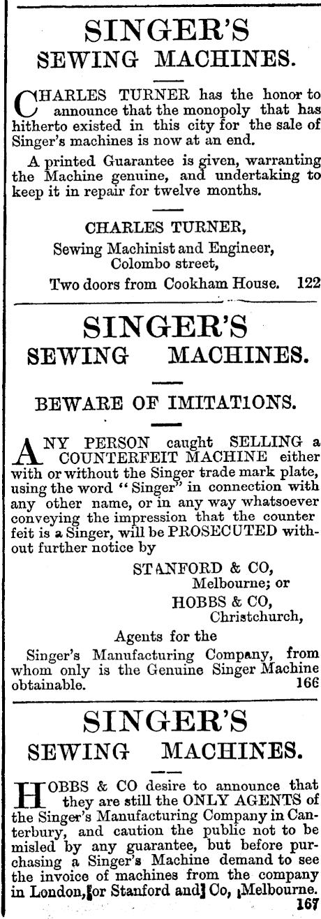 SINGER’S SEWING MACHINES. CHARLES TURNER has the honor to announce that the monopoly that has hitherto existed in this city for the sale of Singer’s machines is now at an end. A printed Guarantee is given, warranting the Machine genuine, and undertaking to keep it in repair for twelve months. CHARLES TURNER, Sewing Machinist and Engineer, Colombo street, Two doors from Cookham House. 122 SINGER’S SEWING MACHINES. BEWARE OF IMITATIONS. ANY PERSON caught SELLING a COUNTERFEIT MACHINE either with or without the Singer trade mark plate, using the word * ‘ Singer” in connection with any other name, or in any way whatsoever conveying the impression that the counter feit is a Singer, will be PROSECUTED without further notice by STANFORD & CO, Melbourne; or HOBBS & CO, Christchurch, Agents for the Singer’s Manufacturing Company, from whom only is the Genuine Singer Machine obtainable. 166 SINGER’S SEWING MACHINES. HOBBS & CO desire to announce that they are still the ONLY AGENTS of the Singer’s Manufacturing Company in Canterbury, and caution the public not to be misled by any guarantee, but before purchasing a Singer’s Machine demand to see the invoice of machines from the company in London,|or Stanford andj Co, iMelboume. i