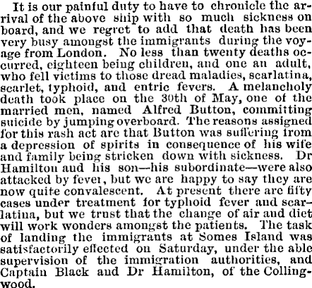 It is our painful duty to have to chronicle the arrival of the above ship with so much sickness on board, and wo regret to add that death lias been very busy amongst the immigrants during the voyage from London. No less than twenty deaths occurred, eighteen being children, and one an adult, who fell victims to those dread maladies, scarlatina, scarlet, typhoid, and cntric fevers. A melancholy death took place on the 30th of May, one of the married men, named Alfred Button, committing suicide by jumping overboard. The reasons assigned for this rash act are that Button was suffering from a depression of spirits in consequence of his wife and family being stricken down with sickness. Dr Hamilton and his son—his subordinate —were also attacked by fevet, but we are happy to say they are now quite convalescent. At present there arc fifty cases under treatment for typhoid fever and scarlatina, but we trust that the change of air and diet will work wonders amongst the patients. The task of landing the immigrants at forties Island was satisfactorily effected on Saturday, under the able supervision of the immigration authorities, and Captain Black and Dr Hamilton, of the Collingwood.