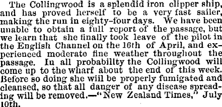 The Collingwood is a splendid iron clipper ship, and has proved herself to be a very fast sailer, making the run in eighty-four days. We have been unable to obtain a full report of the passage, but we learn that she finally took leave of the pilot in the English Channel on the 16th of April, and experienced moderate fine weather throughout the passage. In all probability the Collingwood will come up to the wharf about the end of this week. Before so doing she wiil be properly fumigated and cleansed, so that all danger of any disease spreading will be removed. —“New Zealand Times,” July 10th.