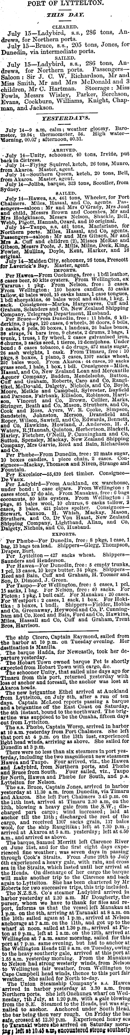 PORT OF LYTTELTON. THIS DAY. CLEARED. July 15—Ladybird, s.s., 286 tons, Andrews, for Northern ports. July 15—Bruce, s.s., 205 tons, Jones, for Dunedin, via intermediate ports. SAILED, July 15—Ladybird, s.s., 286 tons, Andrews, for Northern ports. Passengers— Saloon : Sir J. C. W. Richardson, Mr and Miss Smith, Mr and Mrs McDonald and 3 children, Mr C. Hartman. Steerage : Miss Fowls, Messrs Wisley, Parker, Berchson, Evans, Cockburn, Williams, Knight, Chapman, and Jackson, YESTERDAY’ S. July 14—9 a.m, calm; weather gloomy. Barometer, 29.94; thermometer, 56. High water— Morning, 00.07 j afternoon, 00.31. ARRIVED. July 14—Unity, schooner, 40 tons, Irvine, put back in distress. July 14—Flying Squirrel, ketch, 26 tons, Munro, from Akaroa. Master, agent. July 14—Southern Queen, ketch, 20 tons, Bell, from Akaroa. Master, agent. ■ July 14— Joliba, barque, 323 tons, Scouller, from Sydney. BAILED. July 14—Hawea, s.s, 461 tons, Wheeler, for Port Chalmers. Miles, Hassal, and Co, agents- Passengers—saloon : Mr and Mrs O’Grady, Mrs Joad and child, Messrs Brown and Coombes, Mr and Mrs Hodgkinson, Messrs Nelson, Shackle, Bell, Webb, Pigott, Hannah, Ozard, and 10 original. July 14—Taupo, s.s, 461 tons, Macfarlane, for Northern ports. Miles, Hassal, and Co, agents. Passengers—saloon: Mr and Mrs Gibson, Mr and Mrs A. Cuff and children (2), Misses Mcßae and Gibson, Messrs Poole, J. Mills, Milne, Deck, King, Fowler, Mullins, Doyle, Kent, Barker, and 16 or j^ly a l’4—Maiden City, schooner, 26 tons, Prescott for Laveriok’s Bay, Master, agent. IMPORTS. Per Hawea—From Onehunga, free ; Ibdl leather, 6 cases beer, 50 kits oysters. From Wellington, ex Tararua: 1 pkg. From Nelson, free: 3 cases. From Wellington: 150 boxes candles, 53 casks tallow, 42 bales wool, 15 casks bams, 1 case tongues, 1 bdl sheepskins, 40 bales wool and skins, 1 keg, 1 sack. Consignees—Marks* Hargreaves, Cuff and Graham, Sclanders and Co, New Zealand Shipping Company, Telegraph Department, Husband. Per Bruce—From Dunedin, free : 11 hhds, 6 kilderkins, 3 pkgs, 120 cases, 6 wheels, 36 doors, 5 bdls, 3 casks, 6 pels, 30 boxes, 1 landeau, 26 bales bones, 3fl straps, 74 bars iron, 9 chests, 2 drums, 2 bags, X trunk, X truss, 1 fly wheel, 2 cases galvanised iron, 8 churns, 3 sacks seed, 1 tierce, 12 demijohns. Under bond s 5 cases tobacco, 6 do drugs, 472 mats sugar, 26 sash weights, 1 cask. From Tlmaru, free : 10 pkgs, 8 boxes, 1 piano, 3 cases, 1307 sacks wheat, 257 bales wool. From Akaroa: 44 cases, 20 sacks gass seed, 1 bale, 1 box, 1 bdl. Consignees-Miles, assal, and Co, New Zealand Loan and Mercantile Agency Company, Badden, Mendelsohn, Button, Cuff and Graham, Roberts, Caro and Co, Eangitikei, McDonald, Dalgety, Nichols, and Co, Boyle, Moore, Meikle and Campbell, Sylvester, Bayfield and Parsons, Fairbank, Ellisdon, Robinson, Harrison, Vincent and Co, Brown. Collier, Marks, Stringer Beath and Co, Mason, Struthers, and Co, Cook and Ross, Ayers, W. R. Cooke, Simpson, Sandstein, Johnston, Merson, Dransfleld and Roper, Wilson, Sawtell, and Co, Edwards, Bennett, and Co, Hawkins, Howland, J. Anderson, H. J. Waters, R.lHannah, Quinton, Herbertson, Blackett, Harley, Fletcher, O’Neill, P. Cunningham and Co, Sutton, Spensley, Mackay, New Zealand Shipping Company, Mrs Garvie, Reed and Bain, Richardson and Co. Per Phcebe—From Dunedin, free: 22 mats sugar, 10 boxes candles, 1 piece chain, 2 cases. Consignees—Mackay, Thomson and Niven, Strange and Fountain. , Per Excelsior—ss,439 ieet timber. Consignee— De Vaux. ~ , , Per Ladybird—From Auckland, ex warehouse, under bond: 1 case cigars. From Wellington : 7 cases stout, 27 do ale, From Manakau, free: 6 bags cocoanuts. 50 kits oysters. From Wellington : 3 pkgs, 85 bales wool, 10 churns, 6 casks tallow, 2 cases, 3 bales, 421 plates spelter. Consignees— Stewart, Cannon, H. Whish, Mackay, Mason, Struthers, and Co, Dr Yon Haast, New Zealand Shipping Company, Lightband, Allan, and Co, Dalgety, Nichols, and Co, Husband. EXPORTS. Per Phoebe—For Dunedin, free.- 8 pkgs, 1 case, 1 bag, 13 bags tea lead. Shippers—Glegg, Thompson, Draper, Burt. Per Lyttelton Saunders and Henderson. Per Hawea—For Dunedin, free: 5 empty trunks, 1 pel, 13 cases, 10 kegs butter. 34 pkgs. Shippers— Reed and Bain, Cuff and Graham, H. Toomer and Son, D. Dimond, J. Green. Per Taupo—For Wellington, free: 5 cases, 1 pel, 15 sacks, 1 bag. For Nelson, free; 40 sacks. For Picton: 1 pkg, 1 bull calf. For Manakau: 20 cases. For Westport: 2 cases, 1 sack, 1 box. For Hokitika: 3 boxes, 1 bndl. Shippers—Fielder, Hobbs and Co, Greenaway, Heywoodand Co, P. Cunningham and Co. Reed and Bain, Ford and Co, Hawkins, Miles, Hassall snd Co, Cuff and Graham, Trent Bros, Harrison. The ship Cicero, Captain Raymond, sailed from the harbor at 10 p.m. on Tuesday evening. Her destination Is Manilla. , . , The barque Hadda, for Newcastle, took her departure yesterday. The Hobart Town owned barque Pet is shortly expected from Hobart Town with cargo. &c. The schooner Unity, that sailed nine days ago for Tlmaru from this port, returned yesterday with loss of anchor and foresail, the anchor was lost at Akaroa heads. . , . . ~ , The new brigantine Ethel arrived at Auckland from Lyttelton, on July Bth, after a run of ten days. Captain McLeod reports passing a barque and a brigantine off the East Coast on Saturday, the 4th instant, bound to the northward. The brigantine was supposed to'be the Omaha, fifteen days out from Lyttelton. The s.s. Phoebe, Captain Worsp, arrived in harbor at 10 a.m. yesterday from Port Chalmers. She left that port at 4 p.m. on the 13th lust, experienced light head winds, arriving as above. She sailed for Dunedin at 3 p.m. There were no less than six steamers In port yesterday, including the two magnilicent new steamers Hawea and Taupo. Four arrived, viz., the Hawea and Ladybird, from Northern ports, and Phcebe add Bruce from South. Four sailed, viz., Taupo for North, Hawea and Phoe