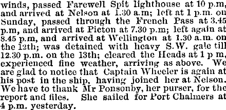 winds, passed Farewell Spit lighthouse at 10 p.m, and arrived at Nelson at l.:!0 a.rn; left at 1 p.m. on Sunday, passed through the French Pass at 3.45 p.m, and arrived at Picton at 7.30 p.m; left again at 8.45 p.m, and arrived at Wellington at 1.30 a.m, on the 12th; was detained with heavy S.W. gale till 12.30 p.m. on the 13th; cleared the Heads at 1 p m, experienced fine weather, arriving as above. We are glad to notice that Captain Wheeler is again at his post in the ship, having joined her at Nelson. We have to thank Mr Ponsonby, her purser, for the report and iiles. She sailed for Port Chalmers at 4 p.m. yesterday.