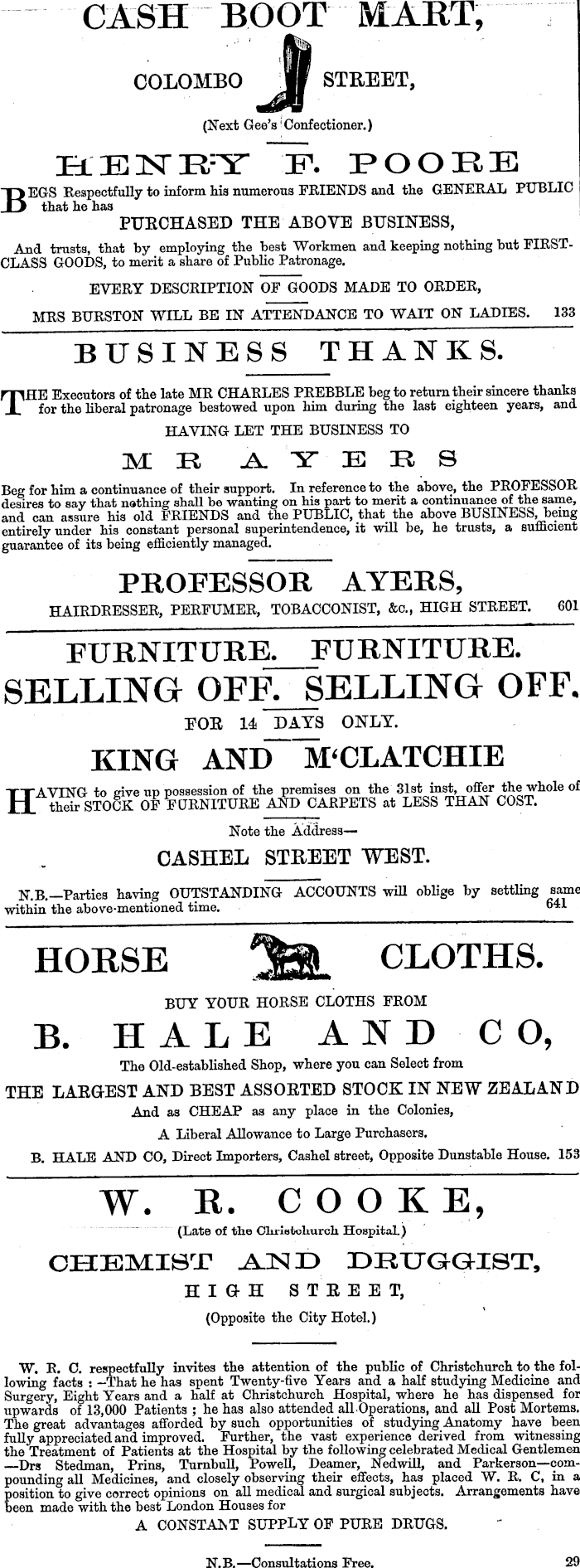 CASH BOOT MART, COLOMBO 'W STREET, (Next Gee’s Confectioner.) I-L ENT ILY F. POORE BEGS Eespectfully to inform his numerous FRIENDS and the GENERAL PUBLIC that he has PURCHASED THE ABOVE BUSINESS, And trusts, that by employing the best Workmen and keeping nothing but FIRSTCLASS GOODS, to merit a share of Public Patronage. EVERY DESCRIPTION OF GOODS MADE TO ORDER, MRS BURSTON WILL BE IN ATTENDANCE TO WAIT ON LADIES. 133 BUSINESS THANKS. THE Executors of the late MR CHARLES PREBBLE beg to return their sincere thanks for the liberal patronage bestowed upon him during the last eighteen years, and HAYING LET THE BUSINESS TO MR .A. Y B R 8 Beg for him a continuance of their support. In reference to the above, the PROFESSOR desires to say that nothing shall be wanting on his part to merit a continuance of the same, and can assure his old FRIENDS and the PUBLIC, that the above BUSINESS, being entirely under his constant personal superintendence, it will be, he trusts, a sufficient guarantee of its being efficiently managed. PROFESSOR AYERS, HAIRDRESSER, PERFUMER, TOBACCONIST, &c., HIGH STREET. 601 FURNITURE. FU RNITURE. SELLING OFF. SELLING OFF. FOE 14 DAYS ONLY. KING AND M‘CLATCHIE H AVING to give up possession of the premises on the 31st inst, offer the whole of their STOCK OP FURNITURE AND CARPETS at LESS THAN COST. Note the Address— CASHEL STREET WEST. N.B.—Parties having OUTSTANDING ACCOUNTS will oblige by settling same within the above-mentioned time. ”41 HOUSE CLOTHS. BUY YOUR HORSE CLOTHS FROM B. HALE AND CO, The Old-established Shop, where you can Select from THE LARGEST AND BEST ASSORTED STOCK IN NEW ZEALAND And as CHEAP as any place in the Colonies, A Liberal Allowance to Large Purchasers, B. TT AT,I7! AND CO, Direct Importers, Cashel street, Opposite Dunstable House, 153 W. B. COOKE, (Late of the Christchurch Hospital. ) CHEMIST AND DRUGGIST, HIGH STEED T, (Opposite the City Hotel.) W. R. C. respectfully invites the attention of the public of Christchurch to the following facts : -That he has spent Twenty-five Years and a half studying Medicine and Surgery, Eight Years and a half at Christchurch Hospital, where he has dispensed for upwards of 13,000 Patients ; he has also attended all Operations, and all Post Mortems, The great advantages afforded by such opportunities of studying Anatomy have been fully appreciated and improved. Further, the vast experience derived from witnessing the Treatment of Patients at the Hospital by the following celebrated Medical Gentlemen —Drs Stedman, Prins, Turnbull, Powell, Deamer, Nedwill, and Parkerson—compounding all Medicines, and closely observing their effects, has placed W. R. C, in a Eosition to give correct opinions on all medical and surgical subjects. Arrangements have een made with the best London Houses for A CONSTANT SUPPLY OP PURE DRUGS. N.B. —Consultations Free. 29