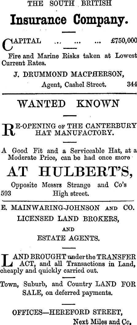THE SOUTH BRITISH Insurance Company. QAPITAL £750,000 Fire and Marine Risks taken at Lowest Current Rates. J. DRUMMOND MACPHERSON, Agent, Cashel Street. 344 WANTED KNOWN Re-opening of the canterbury HAT MANUFACTORY. A Good Fit and a Serviceable Hat, at a Moderate Price, can be had once more AT HULBERT’S, Opposite Messrs Strange and Co’s 593 High street. E. MAINWARING-JOHNSON and CO. LICENSED LAND BROKERS, AND ESTATE AGENTS. LAND BROUGHT under the TRANSFER ACT, and all Transactions in Land, cheaply and quickly carried out. Town, Suburb, and Country LAND FOR SALE, on deferred payments. OFFICES—HEREFORD STREET, Next Miles and Co,