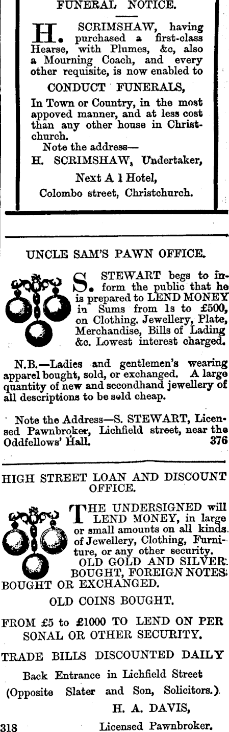 FUNERAL NOTICE. H SCRIMSHAW, having • purchased a first-class Hearse, with Plumes, &c, also a Mourning Coach, and every other requisite, is now enabled to CONDUCT FUNERALS, In Town or Country, in the most appoved manner, and at less cost than any other house in Christchurch. Note the address— H. SCRIMSHAW, Undertaker, Next A I Hotel, Colombo street, Christchurch. UNCLE SAM’S PAWN OFFICE. S STEWART begs to in- • form the public that he is prepared to LEND MONEY in Sums from Is to £SOO, on Clothing. Jewellery, Plate, Merchandise, Bills of Lading &c. Lowest interest charged. N.B. —Ladies and gentlemen’s wearing apparel bought, sold, or exchanged. A largo quantity of new and secondhand jewellery of all descriptions to be sold cheap. Note the Address —S. STEWART, Licensed Pawnbroker, Lichfield street, near the Oddfellows’ Hall. 376 HIGH STREET LOAN AND DISCOUNT OFFICE. THE UNDERSIGNED will LEND MONEY, in large or small amounts on all kinds, of Jewellery, Clothing, Furniture, or any other security. OLD GOLD AND SILVER. _ BOUGHT, FOREIGN NOTES; BOUGHT OR EXCHANGED. OLD COINS BOUGHT. FROM £5 to £IOOO TO LEND ON PER SONAL OR OTHER SECURITY. TRADE BILLS DISCOUNTED DAILY Back Entrance in Lichfield Street (Opposite Slater and Son, Solicitors.) H. A. DAVIS, 318 Licensed Pawnbroker.