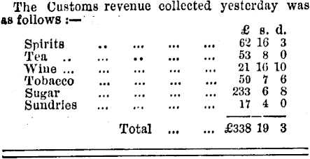 The Customs revenue collected yesterday was as follows £ s. d. Spirits 62 16 3 Tea .. • • 53 8 0 Wiue ... 21 16 10 Tobacco 50 7 6 Sugar 233 6 8 Sundries 17 4 0 Total ft) 1 CO CO 00 19 3
