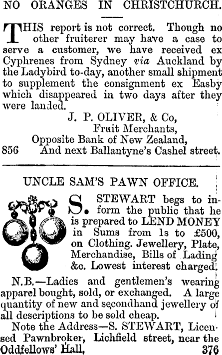 NO ORANGES IN CHRISTCHURCH. THIS report is not correct. Though no other fruiterer may have a case to serve a customer, we have received ex Cyphrenes from Sydney via Auckland by the Ladybird to-day, another small shipment to supplement the consignment ex Easby which disappeared in two days after they were landed. J. P. OLIVER, & Co, Fruit Merchants, Opposite Bank of New Zealand, 856 And next Ballautyne’s Cashel street. UNCLE SAM’S PAWN OFFICE. S STEWART begs to in- • form the public that he is prepared to LEND MONEY in Sums from Is to £SOO, on Clothing. Jewellery, Plate, Merchandise, Bills of Lading &c. Lowest interest charged. N.B.—Ladies and gentlemen’s wearing apparel bought, sold, or exchanged. A large quantity of new and secondhand jewellery of all descriptions to be sold cheap. Note the Address—S. STEWART, Licensed Pawnbroker, Lichfield street, near the Oddfellows’ iiall. 376