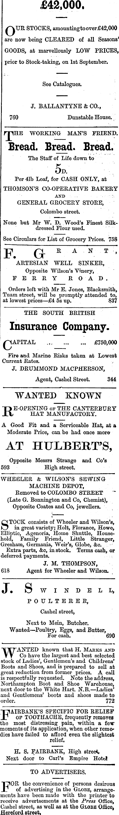 £42,000. STOCKS, amounting to over £42,000 are now being CLEARED of all Seasons’ GOODS, at marvellously LOW PRICES, prior to Stock-taking, on Ist September. See Catalogues. J. BALLANTYNE & CO., 760 Dunstable House. rjIHE WORKING MAN’S FRIEND. Bread. Bread. Bread. The Staff of Life down to sd. Per 41b Loaf, for CASH ONLY, at THOMSON’S CO-OPERATIVE BAKERY AND GENERAL GROCERY STORE, Colombo street. None but Mr W. D. Wood’s Finest Silkdressed Flour used. See Circulars for List of Grocery Prices. 758 Jjl fj RANT ARTESIAN WELL SINKER, Opposite Wilson’s Vinery, FERRY ROAD. Orders left with Mr E. Jones, Blacksmith, Tuam street, will be promptly attended to, at lowest prices—£4 5s up. 837 THE SOUTH BRITISH Insurance Company. OAPITAL £750,000 Fire and Marine Risks taken at Lowest Current Rates. J. DRUMMOND MACPHERSON, Agent, Cashel Street. 344 WANTED KNOWN Re-opening of the Canterbury HAT MANUFACTORY. A Good Fit and a Serviceable Hat, at a Moderate Price, can be had once more AT HULBERT’S, Opposite Messrs Strange and Co’s 593 High street. WHEELER & WILSON’S SEWING MACHINE DEPOT, Removed to COLOMBO STREET ' (Late G. Bonnington and Co, Chemist), Opposite Coates and Co, jewellers. STOCK consists of Wheeler and Wilson’s, in great variety; Holt, Florance, Howe, Elliptic, Agenoria, Home Shuttle, Household, Family Friend, Little Stranger, Gresham, Germania, Weir’s, Globe, &c. Extra parts, &c, in stock. Terms cash, or deferred payments. J, M. THOMPSON, 618 Agent for Wheeler and Wilson. J”. Swindell, POULTERER, Cashel street, Next to Mein, Butcher. Wanted—Poultry, Eggs, and Butter, For cash. 690 WANTED known that H. Marks and Co have the largest and best selected stock of Ladies’, Gentlemen’s and Childrens’ Boots and Shoes, and is prepared to sell at great reduction from former prices. A call is respectfully requested. Note the address, Northampton Boot and Shoe Warehouse, next door to the White Hart. N.B.—Ladies’ and Gentlemens’ boots and shoes made to order. 772 Fairbanks specific for relief of TOOTHACHE, frequently removes the most distressing pain, within a few moments of its application, when other reme' dies have failed to afford even the slightest relief. H. S. FAIRBANK, High street. Next door to Carl’s Empire Hotel TO ADVERTISERS. FOR the convenience of persons desirous of advertising in the Globe, arrangements have been made with the printer to receive advertsements at the Press Office, Cashel street, as well as at the Globe Office, Hereford street,