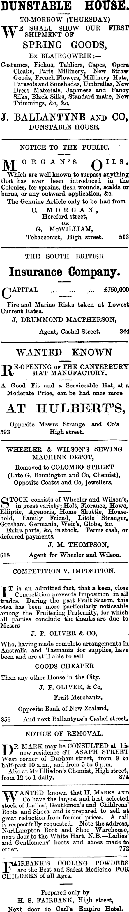 DUNSTABLE HOUSE. TO-MORROW (THURSDAY) WE SHALL SHOW OUR FIRST SHIPMENT OF SPRING GOODS, Ex BLAIRGOWRIE Costumes, Fichus, Tabliers, Capes, Opera Cloaks, Paris Millinery, New Straw Goods, French Flowers, Millinery Hats, Parasols and Sunshades, Umbrellas, New Dress Materials, Japanese and Fancy Silks, Black Silks, Standard make, New Trimmings, &c, &c. J. BALLANTYNE and CO, DUNSTABLE HOUSE. NOTICE TO THE PUBLIC. M ORGAN’S O 1 L S Which are well known to surpass anything that has ever been introduced in the Colonies, for sprains, flesh wounds, scalds or bums, or any outward application, &c. The Genuine Article only to be had from C. MORGAN, Hereford street, OR G. McWILLIAM, Tobacconist, High street. 513 THE SOUTH BRITISH Insurance Company. QAPITAL £750,0001 Fire and Marine Risks taken at Lowest Current Rates. J. DRUMMOND MACPHERSON, Agent, Cashel Street. 344 WANTED KNOWN E-OPENING or THE CANTERBURY 11 HAT MANUFACTORY. A Good Fit and a Serviceable Hat, at a Moderate Price, can be had once more AT HULBERT’S, Opposite Messrs Strange and Go’s 593 High street. WHEELER & WILSON’S SEWING MACHINE DEPOT, Removed to COLOMBO STREET (Late G. Bonnington and Co, Chemist), Opposite Coates and Co, jewellers. STOCK consists of Wheeler and Wilson’s, in great variety; Holt, Florance, Howe, Elliptic, Agenoria, Home Shuttle, Household, Family Friend, Little Stranger, Gresham, Germania, Weir’s, Globe, &c. Extra parts, &c, in stock. Terms cash, or deferred payments. J. M. THOMPSON, 618 Agent for Wheeler and Wilson. COMPETITION V. IMPOSITION. IT is an admitted fact, that a keen, close Competition prevents Imposition in all trades. During the past Fruit Season, this idea has been more particularly noticeable among the Fruitering Fraternity, for which all parties conclude the thanks are due to Messrs J. P. OLIVER & CO, Who, having made complete arrangements in Australia and Tasmania for supplies, have been and are still able to sell GOODS CHEAPER Than any other House in the City. J. P. OLIVER, & Co, Fruit Merchants, Opposite Bank of New Zealand, 856 And next Ballantyne’s Cashel street. NOTICE OF REMOVAL. DR MARK may be CONSULTED at his new residence ST ASAPH STREET West corner of Durham street, from 9 to half-past 10 a.m., and from 5 to 6 p.m. Also at Mr Ellisdon’s Chemist, High street, from 12 to 1 daily. 874 WANTED known that H. Marks akd Co have the largest and best selected stock of Ladies’, Gentlemen’s and Childrens’ Boots and Shoes, and is prepared to sell at great reduction from former prices. A call is respectfully requested. Note the address, Northampton Boot and Shoe Warehouse, next door to the White Hart. N.B.—Ladies’ and Gentlemens’ boots and shoes made to order. 772 Fairbanks cooling powders are the Best and Safest Medicine FOR CHILDREN of all Ages. Prepared only by H. S. FAIRSANK, High street, Next door to Carl’s Empire Hotel.