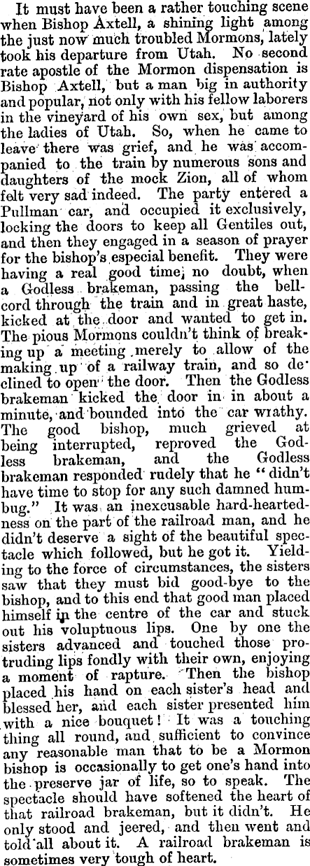 It must have been a rather touching scene when Bishop Axtell, a shining light among the just now much troubled Mormons, lately took his departure from Utah. No second rate apostle of the Mormon dispensation is Bishop Axtell, but a man big in authority and popular, not only with his fellow laborers in the vineyard of his own sex, but among the ladies of Utah. So, when he came to leave there was grief, and he was accompanied to the train by numerous sons and daughters of the mock Zion, all of whom felt very sad indeed. The party entered a Pullman car, and occupied it exclusively, locking the doors to keep all Gentiles out, and then they engaged in a season of prayer for the bishop’s especial benefit. They were having a real good time; no doubt, when a Godless brakeman, passing the bellcord through the train and in great haste, kicked at the door and wanted to get in. The pious Mormons couldn’t think of breaking up a meeting . merely to allow of the making ,up of a railway train, and so dedined to open the door. Then the Godless brakeman kicked the door in in about a minute, and bounded into the car wrathy. The good bishop, much grieved at being interrupted, reproved the Godless brakeman, and the Godless brakeman responded rudely that he “ didn’t have time to stop for any such damned humbug.” It was an inexcusable hard-hearted-ness on the part of the railroad man, and he didn’t deserve a sight of the beautiful spectacle which followed, but he got it. Yielding to the force of circumstances, the sisters saw that they must bid good-bye to the bishop, and to this end that good man placed himself ip the centre of the car and stuck out his voluptuous lips. One by one the sisters advanced and touched those protruding lips fondly with their own, enjoying a moment of rapture. Then the bishop placed his hand on each sister’s head and blessed her, and each sister presented him with a nice bouquet! It was a touching thing all round, and sufficient to convince any reasonable man that to be a Mormon bishop is occasionally to get one’s hand into the preserve jar of life, so to speak. The spectacle should have softened the heart of that railroad brakeman, but it didn’t. He only stood and jeered, and then went and told‘all about it. A railroad brakeman is sometimes very tough of heart.