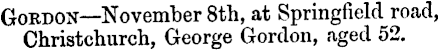 Gordon— November Bth, at Springfield road, Christchurch, George Gordon, aged 52.