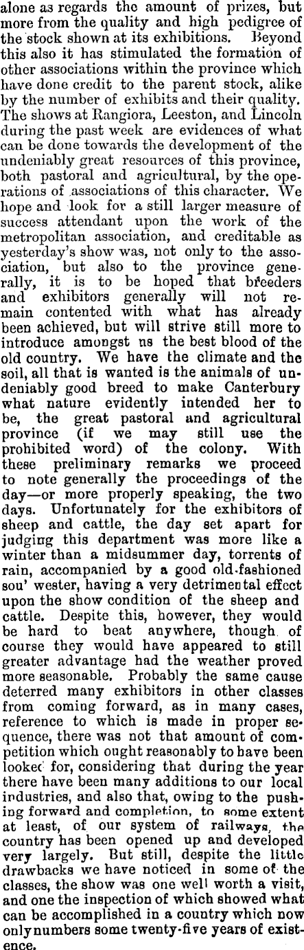 alone as regards the amount of prizes, but more from the quality and high pedigree of the stock shown at its exhibitions, beyond this also it has stimulated the formation of other associations within the province which have done credit to the parent stock, alike by the number of exhibits and their quality. The shows at Rangiora, Leeston, and Lincoln during the past week are evidences of what can be done towards the development of the undeniably great resources of this province, both pastoral and agricultural, by the operations of associations of this character. We hope and look for a still larger measure of success attendant upon the work of the metropolitan association, and creditable as yesterday’s show was, not only to the association, but also to the province generally, it is to be hoped that breeders and exhibitors generally will not remain contented with what has already been achieved, but will strive still more to introduce amongst ns the best blood of the old country. We have the climate and the soil, all that is wanted is the animals of undeniably good breed to make Canterbury what nature evidently intended her to be, the great pastoral and agricultural province (if we may still use the prohibited word) of the colony. With these preliminary remarks we proceed to note generally the proceedings of the day —or more properly speaking, the two days. Unfortunately for the exhibitors of sheep and cattle, the day set apart for judging this department was more like a winter than a midsummer day, torrents of rain, accompanied by a good old-fashioned sou’ wester, having a very detrimental effect upon the show condition of the sheep and cattle. Despite this, however, they would be hard to beat anywhere, though of course they would have appeared to still greater advantage had the weather proved more seasonable. Probably the same cause deterred many exhibitors in other classes from coming forward, as in many cases, reference to which is made in proper sequence, there was not that amount of competition which ought reasonably to have been looker for, considering that during the year there have been many additions to our local industries, and also that, owing to the pushing forward and completion, to some extent at least, of our system of railways, the country has been opened up and developed very largely. But still, despite the little drawbacks we have noticed in some of the classes, the show was one well worth a visit, and one the inspection of which showed what can be accomplished in a country which now only numbers some twenty-five years of existence.