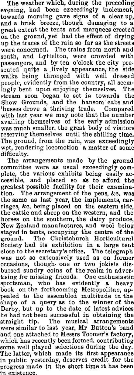 The weather which, during the preceding evening, had been exceedingly inclement, towards morning gave signs of a clear up, and a brisk breeze, though damaging to a great extent the tents and marquees erected on the ground, yet had the effect of drying up the traces of the rain so far as the streets were concerned. The trains from north and south, and Lyttelton, were crowded with passengers, and by ten o’clock the city presented a .lively appearance, the side walks being thronged with well dressed people, evidently from the country, all seemingly bent upon enjoying themselves. The stream soon began to set in towards the Show Grounds, and the hansom cabs and ’busses drove a thriving trade. Compared with last year we may note that the number availing themselves of the early admission was much smaller, the great body of visitors reserving themselves until the shilling time. The ground, from the rain, was exceedingly wet, rendering locomotion a matter of some difficulty. The arrangements made by the ground committee were as usual exceedingly complete, the various exhibits being easily accessible, and placed so ais to afford the greatest possible facility for their examination. The arrangement of the pens, &c, was the same as last year, the implements, carriages, kc, being placed on the eastern side, the cattle and sheep on the western, and the horses on the southern, the dairy produce, New Zealand manufactures, and wool being staged in tents, occupying the centre of the ground. The Christchurch Horticultural Society had its exhibition in a large tent close to the secretary’s office. The telegraph was not so extensively used as on former occasions, though- one or two jokists disbursed sundry coins of the realm in advertising for missing friends. One enthusiastic sportsman, who has evidently a heavy book on the forthcoming Metropolitan, appealed to the assembled multitude in the shape of a query as to the winner of the Derby, but up to the date of latest advices he had not been successful in obtaining the straight tip. The musical arrangements were similar to last year, Mr Button’s band and one attached to Messrs Toomer’s factory, which has recently been formed, contributing some well played selections during the day. The latter, which made its first appearance in public yesterday, deserves credit for the progress made in the short tipje it has been in existence.