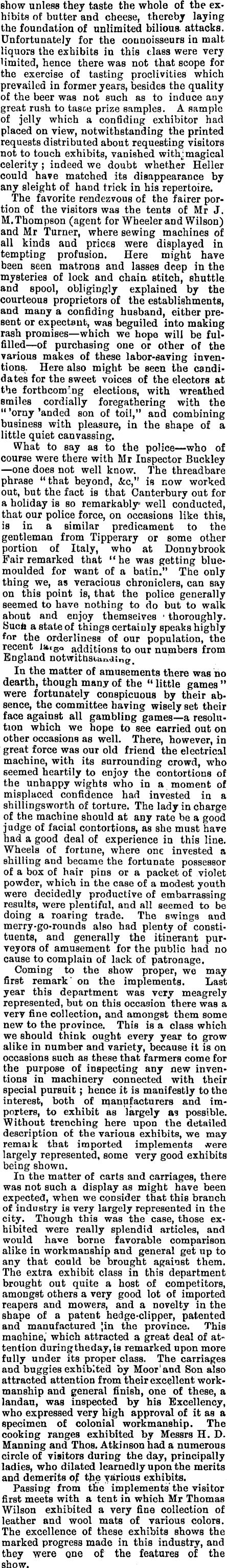 show unless they taste the whole of the exhibits of butter and cheese, thereby laying the foundation of unlimited bilious- attacks. Unfortunately for the connoisseurs in malt liquors the exhibits in this class were very limited, hence there was not that scope for the exercise of tasting proclivities which prevailed in former years, besides the quality of the beer was not such as to induce any great rush to tasce prize samples. A sample of jelly which a confiding exhibitor had placed on view, notwithstanding the printed requests distributed about requesting visitors not to touch exhibits, vanished with;magical celerity ; indeed we doubt whether Heller could have matched its disappearance by any sleight of hand trick in his repertoire. The favorite rendezvous of the fairer portion of the visitors was the tents of Mr J. M,Thompson (agent for Wheeler and Wilson) and Mr Turner, where sewing machines of all kinds and prices were displayed in tempting profusion. Here might have been seen matrons and lasses deep in the mysteries of lock and chain stitch, shuttle and spool, obligingly explained by the courteous proprietors of the establishments, and many a confiding husband, either present or expectant, was beguiled into making rash promises—which we hope will be fulfilled—of purchasing one or other of the various makes of these labor-saving inventions. Here also might be seen the candidates for the sweet voices of the electors at the forthcoming elections, with wreathed smiles cordially foregathering with the “’orny’anded son of toil,” and combining business with pleasure, in the shape of a little quiet canvassing. What to say as to the police—who of course were there with Mr Inspector Buckley —one does not well know. The threadbare phrase “ that beyond, icc," is now worked out, but the fact is that Canterbury out for a holiday is so remarkably well conducted, that our police force, on occasions like this, is in a similar predicament to the gentleman from Tipperary or some other portion of Italy, who at Donnybrook Fair remarked that “he was getting bluemoulded for want of a batin.” The only thing we, as veracious chroniclers, can say on this point is, that the police generally seemed to have nothing to do but to walk about and enjoy themselves thoroughly. Sucfc a state of things certainly speaks highly for the orderliness of our population, the recent lai 5Q additions to our numbers from England notwithstanding. In the matter of amusements there was no dearth, though many of the “ little games ” were fortunately conspicuous by their absence, the committee having wisely set their face against all gambling games—a resolution which we hope to see carried out on other occasions as well. There, however, in great force was our old friend the electrical machine, with its surrounding crowd, who seemed heartily to enjoy the contortions of the unhappy wights who in a moment of misplaced confidence had invested in a shillingsworth of torture. The lady in charge of the machine should at any rate be a good judge of facial contortions, as she must have had a good deal of experience in this line. Wheels of fortune, where one invested a shilling and became the fortunate possessor of a box of hair pins or a packet of violet powder, which in the case of a modest youth were decidedly productive of embarrassing results, were plentiful, and all seemed to be doing a roaring trade. The swings and merry-go-rounds also had plenty of constituents, and generally the itinerant purveyors of amusement for the public had no cause to complain of lack of patronage. Coming to the show proper, we may first remark' on the implements. Last year this department was very meagrely represented, but on this occasion there was a very fine collection, and amongst them some new to the province. This is a class which we should think ought every year to grow alike in number and variety, because it is on occasions such as these that farmers come for the purpose of inspecting any new inventions in machinery connected with their special pursuit ; hence it is manifestly to the interest, both of manufacturers and importers, to exhibit as largely as possible. Without trenching here upon the detailed description of the various exhibits, we may remaik that imported implements were largely represented, some very good exhibits being shown. In the matter of carts and carriages, there was not such a display as might have been expected, when we consider that this branch of industry is very largely represented in the city. Though this was the case, those exhibited were really splendid articles, and would have borne favorable comparison alike in workmanship and general get up to any that could be brought against them. The extra exhibit class in this department brought out quite a host of competitors, amongst others a very good lot of imported reapers and mowers, and a novelty in the shape of a patent hedge-clipper, patented and manufactured |in the province. This machine, which attracted a great deal of attention duringtheday,is remarked upon more fully under its proper class. The carriages and buggies exhibited by Moor’and Son also attracted attention from their excellent workmanship and general finish, one of these, a landau, was inspected by his Excellency, who expressed very high approval of it as a specimen of colonial workmanship. The cooking ranges exhibited by Messrs H. D. Manning and Thos. Atkinson had a numerous circle of visitors during the day, principally ladies, who dilated learnedly upon the merits and demerits of the various exhibits. Passing from the implements the visitor first meets with a tent in which Mr Thomas Wilson exhibited a very fine collection of leather and wool mats of various colors. The excellence of these exhibits shows the marked progress made in this industry, and they were one of the features of the show.