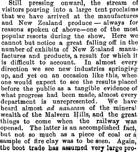 Still pressing onward, the stream of visitors pouring into a large tent proclaims that we have arrived at the manufactures and New Zealand produce always for reasons spoken of above —one of the most popular resorts during the show. Here we cannot but notice a great falling off in the number of exhibits of New Zealand manufactures apd products, a result for which it is difficult to account. In almost every direction we see new industries springing up, and yet on an occasion like t his, when one would expect to see the results placed before the public as a tangible evidence of what progress had been made, almost every department is unrepresented. We have heard almost ad nauseam of the mineral wealth of the Malvern Hills, and the great things to come when the railway was opened. The latter is an accomplished fact, but not so much as a piece of coal or a sample of fire clay was to be seen. Again, the boot trade has assumed very large pro-