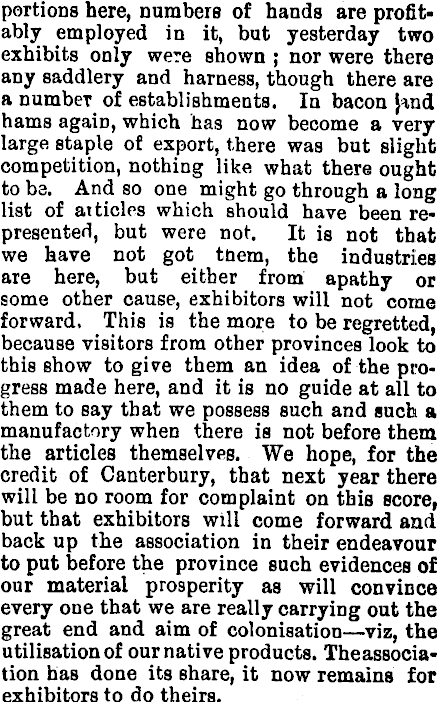 portions here, numbers of hands are profitably employed in it, but yesterday two exhibits only were shown ; nor were there any saddlery and harness, though there are a number of establishments. In bacon [and hams again, which has now become a very large staple of export, there was but slight competition, nothing like what there ought to be. And so one might go through a long list of articles which should have been represented, but were not. It is not that we have not got them, the industries are here, but either from apathy or some other cause, exhibitors will not come forward. This is the more to be regretted, because visitors from other provinces look to this show to give them an idea of the progress made here, and it is no guide at all to them to say that we possess such and such a manufactory when there is not before them the articles themselves. We hope, for the credit of Canterbury, that next year there will be no room for complaint on this score, but that exhibitors will come forward and back up the association in their endeavour to put before the province such evidences of our material prosperity as will convince every one that we are really carrying out the great end and aim of colonisation—viz, the utilisation of our native products. Theassociation has done its share, it now remains for exhibitors to do theirs.