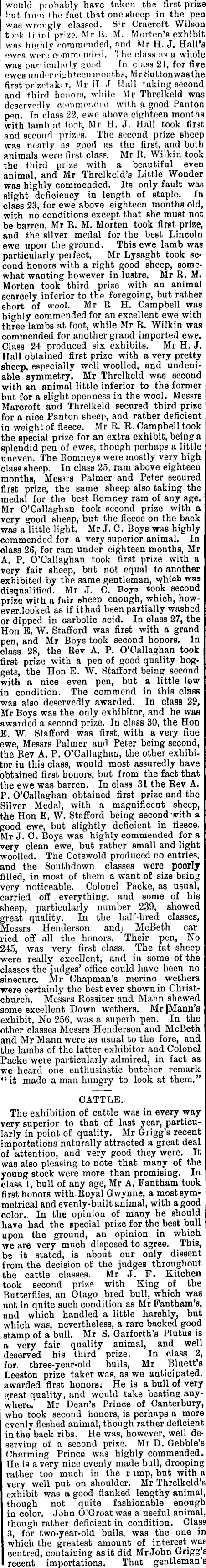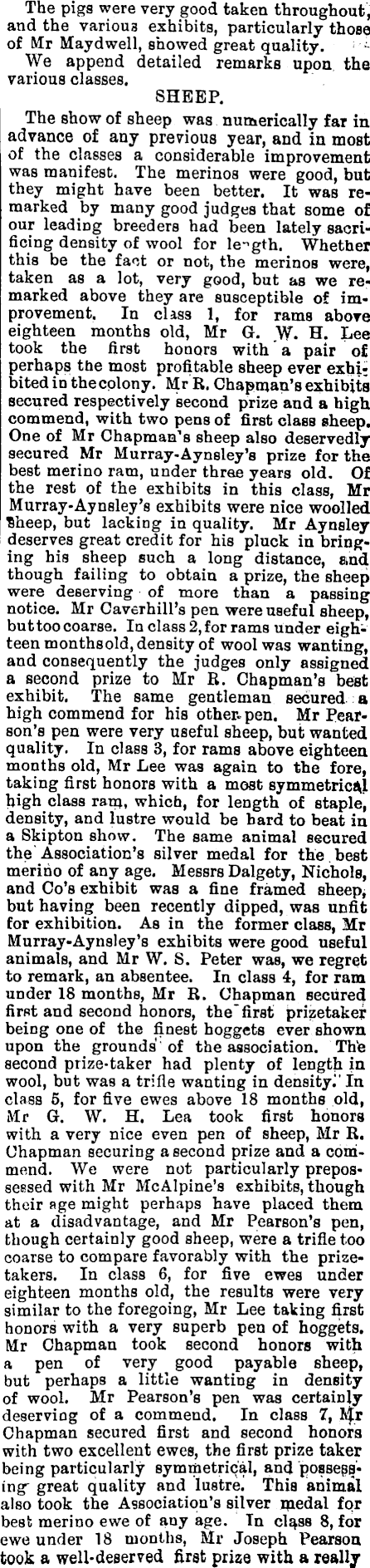 The pigs were very good taken throughout, and the various exhibits, particularly those of Mr Maydwell, showed great quality. We append detailed remarks upon the various classes. SHEEP. The show of sheep was numerically far in advance of any previous year, and in most of the classes a considerable improvement was manifest. The merinos were good, but they might have been better. It was remarked by many good judges that some of our leading breeders had been lately sacrificing density of wool for length. Whether this be the fact or not, the merinos were, taken as a lot, very good, but as we remarked above they are susceptible of improvement, In class I, for rams above eighteen months old, Mr G. W. H. Lee took the first honors with a pair of perhaps the most profitable sheep ever exhibited in the colony. Mr R. Chapman’s exhibits secured respectively second prize and a high commend, with two pens of first class sheep. One of Mr Chapman’s sheep also deservedly secured Mr Murray-Aynsley’s prize for the best merino ram, under three years old. Of the rest of the exhibits in this class, Mr Murray-Aynsley’s exhibits were nice woolled Sheep, but lacking in quality. Mr Aynsley deserves great credit for his pluck in bringing his sheep such a long distance, and though failing to obtain a prize, the sheep were deserving of more than a passing notice. Mr Caverhill’s pen were useful sheep, buttoocoarse. In class 2,for rams under eighteen months old, density of wool was wanting, and consequently the judges only assigned a second prize to Mr R. Chapman’s best exhibit. The same gentleman secured a high commend for his other-pen. Mr Pearson’s pen were very useful sheep, but wanted quality. In class 3, for rams above eighteen months old, Mr Lee was again to the fore, taking first honors with a most symmetrical high class ram, which, for length of staple, density, and lustre would be hard to beat in a Skipton show. The same animal secured the Association’s silver medal for the best merino of any age. Messrs Dalgety, Nichols, and Go’s exhibit was a fine framed sheep, but having been recently dipped, was unfit for exhibition. As in the former class, Mr Murray-Aynsley’s exhibits were good useful animals, and Mr W. S. Peter was, we regret to remark, an absentee. In class 4, for ram under 18 months, Mr R. Chapman secured first and second honors, the* first prizetaker being one of the finest hoggets ever shown upon the grounds' of the association. The second prize-taker had plenty of length in wool, but was a trifle wanting in density!' In class 5, for five ewes above 18 months old, Mr G. W. H. Lea took first honors with a very nice even pen of sheep, Mr R. Chapman securing a second prize and a commend. We were not particularly prepossessed with Mr McAlpine’s exhibits, though their age might perhaps have placed them at a disadvantage, and Mr Pearson’s pea, though certainly good sheep, were a trifle too coarse to compare favorably with the prizetakers. In class 6, for five ewes under eighteen months old, the results were very similar to the foregoing, Mr Lee taking first honors with a very superb pen of hoggets. Mr Chapman took second honors with a pen of very good payable sheep, but perhaps a little wanting in density of wool. Mr Pearson’s pen was certainly deserving of a commend. In class 7, Hr Chapman secured first and second honors with two excellent ewes, the first prize taker being particularly symmetrical, and possessing great quality and lustre. This animal also took the Association’s silver medal for best merino ewe of any age. In class 8, for ewe under 18 months, Mr Joseph Pearson took a well-deserved first prize with a really