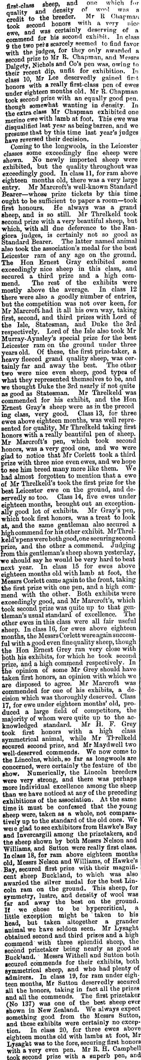 first-class sheep, and one which f..p quality and density of wnM wns a credit to the breeder. Mr B Chapman took second honors with a vary nice e we and was certainly deserving 0 f a commend for his second exhibit. In class 9 the two pens scarcely seemed to find favor with the judges, for they only awarded a second prize to Mr R. Chapman, and Messrs Dalgety, Nichols and Go’s pen was, owing to their recent dip, unfit for exhibition. In class 10, Mr Re® deservedly gained first honors with a really first-class pen of ewes under eighteen months old. Mr R. Chapman took second prize with an equally good pen. though somewhat wanting in density. In the extra class Mr Chapman exhibited one merino ewe with lamb at foot. This ewe was disqualified last year as being barren, and we presume that by this time last year’s judges have reversed their decision. Coming to the longwools, in the Leicester classes some exceedingly fine -sheep were shown. No newly imported sheep were exhibited, but the quality throughout was exceedingly good. In class 11, for ram above eighteen months old, there was a very large entry. Mr Marcroft’s well-known Standard Bearer—whose prize tickets by this time ought to be sufficient to paper a room—took first honours. He always was a grand sheep, and is so still. Mr Threlkeld took second prize with a very beautiful sheep, but which, with all due deference to the Eanfiora judges, is certainly not so good as tandard Bearer. The latter named animal also took the association’s medal for the best Leicester ram of any age on the ground. The Hon Ernest Gray exhibited some exceedingly nice sheep in this class, and secured a third prize and a high commend. The rest of the exhibits were mostly above the average. In class 12 there were also a goodly number of entries, but the competition was not over keen, for Mr Marcroft had it all his own way, taking first, second, and third prizes with Lord of the Isle, Statesman, and Duke the 3rd respectively. Lord of the Isle also took Mr Murray-Aynsley’s special prize for the best Leicester ram on the ground under three years old. Of these, the first prize-taker, a heavy fleeced grand quality sheep, was certainly far and away the best. The other two were nice even sheep, good types of what they represented themselves to be, and we thought Duke the 3rd nearly if not quite as good as Statesman. Mr Threlkeld was commended for his exhibit, and the Hon Ernest Gray’s sheep were as in the preced ing class, very good. Class 13, for three ewes above eighteen months, was well represented for quality, Mr Threlkeld taking first honors with a really beautiful pen of sheep. Mr Marcroft’s pen, which took second honors, was a very good one, and we were glad to notice that Mr Corlett took a third prize with three nice even ewes, and we hope to see him breed many more like them. We had almost forgotten to mention that a ewe of Mr Threlkeld’s took the first prize for the best Leicester ewe on the ground, and deservedly so too. Class 14, five ewes under eighteen months, brought out an exceptionally good lot of exhibits. Mr Gray’s pen, which took first honors, was a treat to look at, and the same gentleman also secured a high commend for his other exhibit. MrThrelkeld’spenswerebothgood, one securing second prize, and the other a commend. Judging from this gentleman’s sheep shown yesterday, we should say he would be very hard to beat next year. In class 15 for ewes above eighteen months old with lamb at foot, the Messrs Corlett came again to the front, taking Hie first prize with one pen, and a high commend with the other. Both exhibits were exceedingly good, and Mr Marcroft’s, which took second prize was quite up to that gentleman’s usual standard of excellence. The other ewes in this class were all fair useful sheep. In class 16, for ewes above eighteen months, the Messrs Corlett were again successful with a good even fine quality sheep, though the Hon Ernest Grey ran very close with Jj'pth his exhibits, for which he took second prize, and a high commend respectively. In the’ opinion of some Mr Grey should have taken first honors, an opinion with which we are disposed to agree. Mr Marcroft was commended for one of his exhibits, a decision which was thoroughly deserved. Class 17 for ewe under eighteen months’ old, produced a large field of competitors, the majority of whom were quite up to the acknowledged standard. Mr H. F. Grey took first honors with a high class symmetrical animal, while Mr Pi rclkcld secured second prize, and Mr Maydwell two well-deserved commends. We now come to the Lincolns, which, so far as longwools are concerned, were certainly the feature of the show. Numerically, the Lincoln breeders were very strong, and there was perhaps more individual excellence among the sheep than we have noticed at any of the preceding exhibitions of the association. At the same time it must be confessed that the young sheep were, taken as a whole, not comparatively up to the standard of the old ones. We wei e glad to see exhibitors from Hawke’s Bay and Invercargill among the prizetakers, and the sheep shown by both Messrs Nelson and Williams, and Sutton were really first class. In class 18, for ram above eighteen months old, Messrs Nelson and Williams, of Hawke’s Bay, secured first prize with their magnificent sheep Buckland, to which was also awarded the silver medal for the best Lincoln ram on the ground. This sheep, for symmetry, lustre, and density of wool was far and away the best on the ground. If we chose to be hypercritical, a little exception might be taken to his bead, but taken altogether a grander animal we tave seldom seen. Mr Lysaght obtained second and third prizes and a high commend with three splendid sheep, the second prizetaker being nearly as good as Buckland. Messrs Withell and Sutton both secured commends for their exhibits, both symmetrical sheep, and who had plenty of admirers. In class 19, for ram under eigh