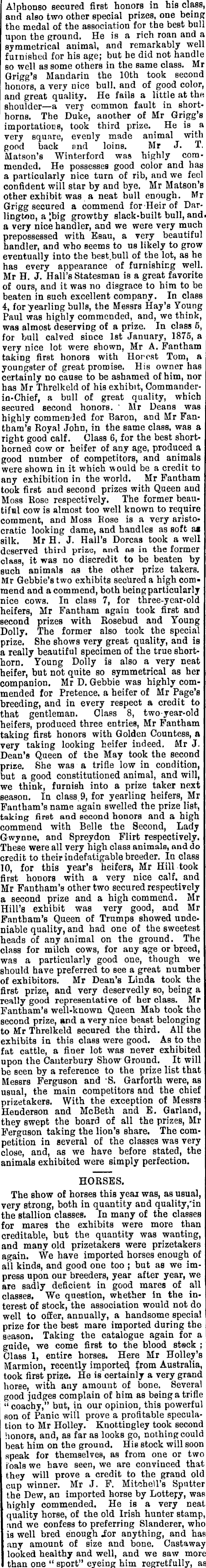 Alphonse secured first honors in his class, and also two other special prizes, one being the medal of the association for the best bull upon the ground. He is a rich roan and a symmetrical animal, and remarkably well furnished for his age; but he did not handle so well as some others in the same class. Mr Grigg’s Mandarin the 10th took second honors, a very nice bull, and of good color, and great quality. He fails a little at the shoulder —a very common fault in shorthorns. The Duke, another of Mr Grigg’s importations, took third prize. He is a very square, evenly made animal with good back and loins. Mr J. T. Matson’s Winterford was highly commended. He possesses good color and has a particularly nice turn of rib, and we feel confident will star by and bye. Mr Matson’s other exhibit was a neat bull enough. Mr Grigg secured a commend for Heir of Darlington, a |big growtby slack-built bull, and. a very nice handler, and we were very much prepossessed with Esau, a very beautiful handler, and who seems to us likely to grow eventually into the best.tmll of the lot, as he has every appearance of furnishing well. Mr H. J. Hall’s Statesman is a great favorite of ours, and it was no disgrace to him to be beaten in such excellent company. In class 4, for yearling bulls, the Messrs Hay’s Young Paul was highly commended, and, we think, was almost deserving of a prize. In class 5, for bull calved since Ist January, 1875, a very nice lot were shown, Mr A, Fantham taking first honors with Horost Tom, a youngster of great promise. His owner has certainly no cause to be ashamed of him, nor has Mr Threlkeld of his exhibit, Commander-io-Chief, a bull of great quality, which secured second honors. Mr Deans was highly commended for Baron, and Mr Fantham’s Royal John, in the same class, was a right good calf. Class 6, for the best shorthorned cow or heifer of any age, produced a good number of competitors, and animals were shown in it which would be a credit to any exhibition in the world. Mr Fantham took first and second prizes with Queen and Moss Rose respectively. The former beautiful cow is almost too well known to require comment, and Moss Rose is a very aristocratic looking dame, and handles as soft aa silk. Mr H. J. Hall’s Dorcas took a well deserved third prize, and as in the former class, it was no discredit to be beaten by such animals as the other prize takers. Mr Gebbie’s two exhibits secured a high commend and a commend, both being particularly nice cows. In class 7, for three-year-old heifers, Mr Fantham again took first and second prizes with Rosebud and Young Dolly. The former also took the special prize. She shows very great quality, and is a really beautiful specimen of the true shorthorn, Young Dolly is also a very neat heifer, but not quite so symmetrical as her companion. Mr D. Gebbie was highly commended for Pretence, a heifer of Mr Page’s breeding, and in every respect a credit to that gentleman. Class 8, two-year-old heifers, produced three entries, Mr Fantham taking first honors with Golden Countess, a very taking looking heifer indeed. Mr J. Dean’s Queen of the May took the second prize. She was a trifle low in condition, but a good constitutioned animal, and will, we think, furnish into a prize taker next season. In class 9, for yearling heifers, Mr Fantham’s name again swelled the prize list, taking first and second honors and a high commend with Belle the Second, Lady Gwynne, and Spreydon Flirt respectively. These were all very high class animals, and do credit to their indefatigable breeder. In class 10, for this year’s heifers, Mr Hill took first honors with a very nice calf, and Mr Fantham’s other two secured respectively a second prize and a high commend. Mr Hill’s exhibit was very good, and Mr Fantbam’s Queen of Trumps showed undeniable quality, and had one of the sweetest heads of any animal on the ground. The class for milch cows, for any age or breed, was a particularly good one, though we should have preferred to see a great number of exhibitors. Mr Dean’s Linda took the first prize, and very deservedly so, being a really good representative of her class. Mr Fantham’s well-known Queen Mab took the second prize, and a very nice beast belonging to Mr Threlkeld secured the third. All the exhibits in this class were good. As to the fat cattle, a finer lot was never exhibited upon the Canterbury Show Ground. It will be seen by a reference to the prize list that Messrs Ferguson and - S. Garforth were, as usual, the main competitors and the chief prizetakers. With the exception of Messrs Henderson and Mcßeth and E, Garland, they swept the board of all the prizes, Mr Ferguson taking the lion’s share. The competition in several of the classes was very close, and, as we have before stated, the animals exhibited were simply perfection. HORSES. The show of horses this year was, as usual, very strong, both in quantity and quality,“in the stallion classes. In many of the classes for mares the exhibits were more than creditable, but the quantity was wanting, and many old prizetakers were prizetakers again. We have imported horses enough of all kinds, and good one too ; but as we impress upon our breeders, year after year, we are sadly deficient in good mares of all classes. We question, whether in the interest of stock, the association would not do well to offer, annually, a handsome special prize for the best mare imported during the season. Taking the catalogue again for a guide, we come first to the blood stack ; Class 1, entire horses. Here Mr Holley’s Marmion, recently £rom Australia, took first prize. He is certainly a very grand horse, with any amount of bone. Several good judges complain of him as being a trifle “ coachy," but, in our opinion, this powerful son of Panic will prove a profitable speculation to Mr Holley. Knottingley took second honors, and, as far as looks go, nothing could beat him on the ground. His stock will soo