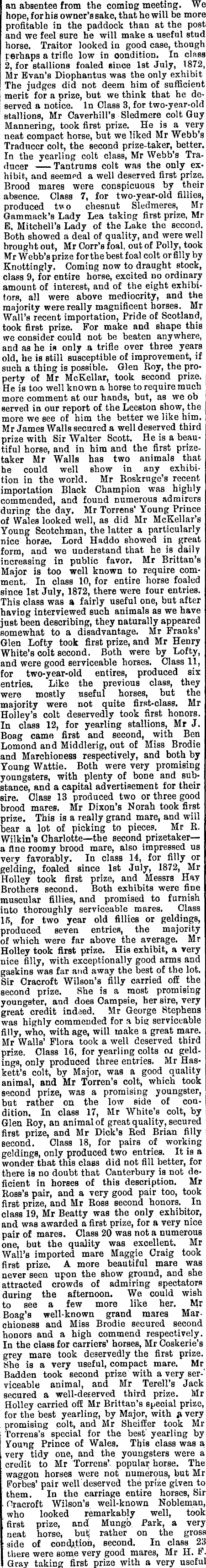 an absentee from the coming meeting. We hope, for his owner’s sake, that he will be more profitable in the paddock than at the post and we feel sure he will make a useful stud horse. Traitor looked in good case, though perhaps a trifle low in condition. In class 2, for stallions foaled since Ist July, 1872, Mr Bvan’s Diophantus was the only exhibit The judges did not deem him of sufficient merit for a prize, but we think that he deserved a notice. In Class 3, for two-year-old stallions, Mr Caverhill’s Sledmere colt Guy Mannering, took first prize. He is a very neat compact horse, but we liked Mr Webb’s Traducer colt, the second prize-taker, better. In the yearling colt class, Mr Webb’s Traducer Tantrums colt was the only exhibit, and seemed a well deserved first prize. Brood mares were conspicuous by their absence. Class 7, for two-year-old fillies, produced two chesnut Sledmeres, Mr Gammack’s Lady Lea taking first prize, Mr B, Mitchell’s Lady of the Lake the second. Both showed a deal of quality, and were well brought out, Mr Corr’s foal, out of Polly, took Mr Webb’s prize for the best foal colt or filly by Knottingly. Coming now to draught stock, class 9, for entire horse, excited no ordinary amount of interest, and of the eight exhibitors, all were above mediocrity, and the majority were really magnificent horses. Mr Wall’s recent importation, Pride of Scotland, took first prize. For make and shape this we consider could not be beaten anywhere, and as he is only a trifle over three years old, he is still susceptible of improvement, if such a thing is possible. Glen Roy, the property of Mr McKellar, took second prize. He is too well known a horse to require much more comment at our hands, but, as we ob served in our report of the Leeston show, the more we see of him the better we like him. Mr James Walls secured a well deserved third prize with Sir Walter Scott, He is a beautiful horse, and in him and the first prizetaker Mr Walls has two animals that he could well show in any exhibition in the world. Mr Roskruge’s recent importation Black Champion was highly commended, and found numerous admirers during the day, Mr Torrens’ Young Prince of Wales looked well, as did Mr McKellar’s Young Scotchman, the latter a particularly nice horse. Lord Haddo showed in great form, and we understand that he is daily increasing in public favor. Mr Brittan’s Major is too well known to require comment. In class 10, for entire horse foaled since Ist July, 1872, there were four entries. This class was a fairly useful one, but after having interviewed such animals as we have just been describing, they naturally appeared somewhat to a disadvantage. Mr Franks’ Glen Lofty took first prize, and Mr Henry White’s colt second. Both were by Lofty, and were good serviceable horses. Class 11, for two-year-old entires, produced six entries. Like the previous class, they were mostly useful horses, but the majority were not quite first-class. Mr Holley’s colt deservedly took first honors. In class 12, for yearling stallions, Mr J. Boag came first and second, with Ben Lomond and Middlerig, out of Miss Brodie and Marchioness respectively, and both by Young Wattie. Both were very promising youngsters, with plenty of bone and substance, and a capital advertisement for their sire. Class 13 produced two or three good brood mares. Mr Dixon’s Norah took first prize. This is a really grand mare, and will bear a lot of picking to pieces, Mr R. Wilkin's Charlotte—the second prizetaker—a fine roomy brood mare, also impressed us very favorably. In class 14, for filly or gelding, foaled since Ist July, 1872, Mr Holley took first prize, and Messrs Hay Brothers second. Both exhibits were fine muscular fillies, and promised to furnish into thoroughly serviceable mares. Class 15, for two year old fillies or geldings, produced seven entries, the majority of which were far above the average. Mr Holley took first prize. His exhibit, a very nice filly, with exceptionally good arms and gaskins was far and away the best of the lot. Sir Cracroft Wilson’s filly carried off the second prize. She is a most promising youngster, and does Campsie, her sire, very great credit indeed. Mr George Stephens was highly commended for a big serviceable filly, who, with age, will make a great mare. Mr Walls’ Flora took a well deserved third prize. Class 16, for yearling colts oi geldings, only produced three entries. Mr Haskett’s colt, by Major, was a good quality animal, and Mr Torren’s colt, which took second prize, was a promising youngster, but rather on the low side of condition. In class 17, Mr White’s colt, by Glen Roy, an animal of great quality, secured first prize, and Mr Dick’s Red Brian filly second. Class 18, for pairs of working geldings, only produced two entries. It is a wonder that this class did not fill better, for there is no doubt that Canterbury is not deficient in horses of this description. Mr Ross’s pair, and a very good pair too, took first prize, and Mr Ross second honors. In class 19, Mr Beatty was the only exhibitor, and was awarded a first prize, for a very nice pair of mares. Class 20 was not a numerous one, but the quality was excellent, Mr Wall’s imported mare Maggie Craig took first prize. A more beautiful mare was never seen upon the show ground, and she attracted crowds of admiring spectators during the afternoon. We could wish to see a few more like her. Mr Boag’s well-known grand mares Marchioness and Miss Brodie secured second honors and a high commend respectively. In the class for carriers’ horses, Mr Coskerie’s grey mare took deservedly the first prize. She is a very useful, compact mare. Mr Badden took second prize with a very serviceable animal, and Mr Terell’s Jack secured a well-deserved third prize. Mr Holley carried off Mr Brittan’s special prize, for the best yearling, by Major, with &. very promising colt, and Mr Sheiffer took Mr Torrens’s spec