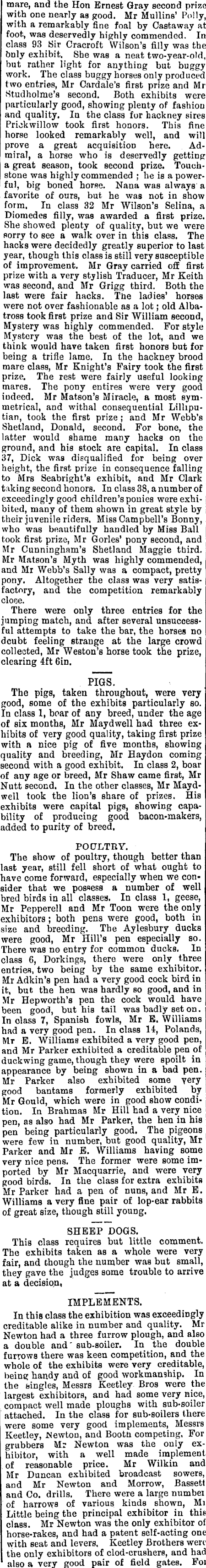 mare, and the Hon Ernest Gray second prize with one nearly as good. Mr Mullins’ Polly, with a remarkably fine foal by Castaway at foot, was deservedly highly commended. In class 93 Sir Cracroft Wilson’s filly was the bnly exhibit. She was a neat two-year-old, but rather light for anything but buggy work. The class buggy horses only produced two entries, Mr Cardale’s first prize and Mr Studholme’s second. Both exhibits were particularly good, showing plenty of fashion and quality, In the class for hackney sires Prickwillow took first honors. This fine horse looked remarkably well, and will prove a great acquisition here. Admiral, a horse who is deservedly getting a great season, took second prize. Touchstone was highly commended ; he is a powerful, big boned horse. Nana was always a favorite of ours, but he was not in show form, In class 32 Mr Wilson’s Selina, a Diomedes filly, was awarded a first prize. She showed plenty of quality, but we were sorry to see a walk over in this class. The hacks were decidedly greatly superior to last year, though this class is still very susceptible of improvement. Mr Gray carried off first prize with a very stylish Traducer, Mr Keith was second, and Mr Grigg third. Both the last were fair hacks. The ladies’ horses were not over fashionable as a lot; old Albatross took first prize and Sir William second, Mystery was highly commended. For style Mystery was the best of the lot, and we think would have taken first honors but for being a trifle lame. In the hackney brood mare class, Mr Knight’s Fairy took the first prize. The rest were fairly useful looking mares. The pony entires were very good indeed. Mr Matson’s Miracle, a most symmetrical, and withal consequential Lilliputian, took the first prize ; and Mr Webb’s Shetland, Donald, second. For bone, the latter would shame many hacks on the ground, and his stock are capital. In class 37, Dick was disqualified for being over height, the first prize in consequence falling to Mrs Seabright’s exhibit, and Mr Clark taking second honors. In class 38, a number of exceedingly good children’s ponies were exhibited, many of them shown in great style by their juvenile riders. Miss Campbell’s Bonny, who was beautifully handled by Miss Ball took first prize, Mr Glories’ pony second, and Mr Cunningham’s Shetland Maggie third. Mr Matson’s Myth was highly commended, and Mr Webb’s Sally was a compact, pretty pony. Altogether the class was very satisfactory, and the competition remarkably close. There were only three entries for the jumping match, and after several unsuccessful attempts to take the bar, the horses no dcubt feeling strange at the large crowd collected, Mr Weston’s horse took the prize, clearing 4ft 6in, PIGS. The pigs, taken throughout, were very good, some of the exhibits particularly so. In class 1, boar of any breed, under the age of six months, Mr Maydwell had three exhibits of very good quality, taking first prize with a nice pig of five months, showing quality and breeding, Mr Haydon coming second with a good exhibit. In class 2, boar of any age or breed, Mr Shaw came first, Mr Nutt second. In the other classes, Mr Maydwell took the lion’s share of prizes. His exhibits were capital pigs, showing capability of producing good bacon-makers, added to purity of breed. POULTRY. The show of poultry, though better than last year, still fell short of what ought to have come forward, especially when we consider that we possess a number of well bred birds in all classes. In class 1, geese, Mr Pepperell and Mr Toon were the only exhibitors; both pens were good, both in size and breeding. The Aylesbury ducks were good, Mr Hill’s pen especially so. There was no entry for common ducks. In class 6, Dorkings, there were only three entries, two being by the same exhibitor. Mr Adkin’s pen had a very good cock bird in it, but the hen was hardly so good, and in Mr Hepworth’s pen the cock would have been good, but his tail was badly set on. In class 7, Spanish fowls, Mr E. Williams had a very good pen. In class 14, Polands, Mr B. Williams exhibited a very good pen, and Mr Parker exhibited a creditable pen of duckwing game, though they were spoilt in appearance by being shown in a bad pen. Mr Parker also exhibited some very good bantams formerly exhibited by Mr Gould, which were in good show condition. In Brahmas Mr Hill had a very nice pen, as also had Mr Parker, the hen in his pen being particularly good. The pigeons were few in number, but good quality, Mr Parker and Mr B. Williams having some very nice pens. The former were some imported by Mr Macquarrie, and were very good birds. In the class for extra exhibits Mr Parker had a pen of nuns, and Mr B. Williams a very fine pair of lop-ear rabbits of great size, though still young. SHEEP DOGS. This class requires but little comment. The exhibits taken as a whole were very fair, and though the number was but small, they gave the judges some trouble to arrive at a decision, IMPLEMENTS. In this class the exhibition was exceedingly creditable alike in number and quality. Mr Newton had a three furrow plough, and also a double and" sub-soiler. In the double furrows there was keen competition, and the whole of the exhibits were very creditable, being handy and of good workmanship. In the singles, Messrs Keetley Bros were the largest exhibitors, and had some very nice, compact well made ploughs with sub-soiler attached. In the class for sub-soilers there were some very good implements, Messrs Keetley, Mewtou, and Bootn competing, For grubbers Mr Newton was the only exhibitor, with a well made implement of reasonable price. Mr Wilkin and Mr Duncan exhibited broadcast sowers, and Mr Newton and Morrow, Bassett and Co. drills. There were a large numbei of harrows of various kinds shown, Mi Little being the principal exhibitor in this class. Mr Newton was the only exhibitor of horse-rakes, and had a patent self-acting one with seat and levers. Ke