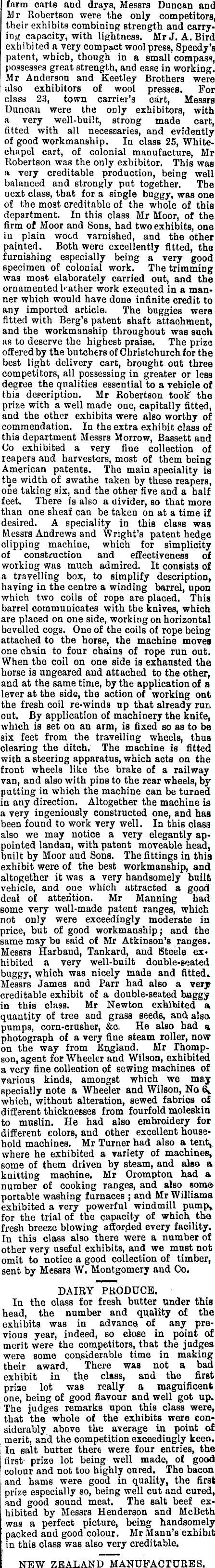 farm carts and drays, Messrs Duncan and Mr Robertson were the only competitors, their exhibits combining strength and carrying capacity, with lightness. Mr J. A. Bird exhibited a very compact wool press, Speedy’s patent, which, though in a small compass, possesses great strength, and ease in working. Mr Anderson and Keetley Brothers were also exhibitors of wool presses. For class 23, town carrier’s cart, Messrs Duncan were the only exhibitors, with a very well-built, strong made cart, fitted with all necessaries, and evidently of good workmanship. In class 25, Whitechapel cart, of colonial manufacture, Mr Robertson was the only exhibitor. This was a very creditable production, being well balanced and strongly put together. The uext class, that for a single buggy, was one of the most creditable of the whole of this department. In this class Mr Moor, of the firm of Moor and Sons, had two exhibits, one in plain wood varnished, and the other painted. Both were excellently fitted, the furnishing especially being a very good specimen of colonial work. The trimming was most elaborately carried out, and the ornamented b ather work executed in a manner which would have done infinite credit to any imported article. The buggies were fitted with Berg’s patent shaft attachment, and the workmanship throughout was such as to deserve the highest praise. The prize offered by the butchers of Christchurch for the best light delivery cart, brought out three competitors, all possessing in greater or less degree the qualities essential to a vehicle of this description. Mr Robertson took the prize with a well made one, capitally fitted, and the other exhibits were also worthy of commendation. In the extra exhibit class of this department Messrs Morrow, Bassett and Co exhibited a very fine collection of reapers and harvesters, most of them being American patents. The main speciality is the width of swathe taken by these reapers, one taking six, and the other five and a half feet. There is also a divider, so that more than one sheaf can be taken on at a time if desired. A speciality in this class was Messrs Andrews and Wright’s patent hedge clipping machine, which for simplicity of construction and effectiveness of working was much admired. It consists of a travelling box, to simplify description, haying in the centre a winding barrel, upon which two coils of rope are placed. This barrel communicates with the knives, which are placed on one side, working on horizontal bevelled cogs. One of the coils of rope being attached to the horse, the machine move® one chain to four chains of rope run out. When the coil on one side is exhausted the horse is ungeared and attached to the other, and at the same time, by the application of a lever at the side, the action of working ont the fresh coil re-winds up that already run out. By application of machinery the knife,, which is set on an arm, is fixed so as to be six feet from the travelling wheels, thus clearing the ditch. The machine is fitted with a steering apparatus, which acts on the front wheels like the brake of a railway van, and also with pins to the rear wheels, by putting in which the machine can be turned in any direction. Altogether the machine is a very ingeniously constructed one, and has been found to work very well. In this class also we may notice a very elegantly appointed landau, with patent moveable head, built by Moor and Sons. The fittings in this exhibit were of the best workmanship, and altogether it was a very handsomely built vehicle, and one which attracted a good deal of attention. Mr Manning had some very well-made patent ranges, which not only were exceedingly moderate in price, but of good workmanship; and the same may be said of Mr Atkinson’s ranges. Messrs Harband, Tankard, and Steele exhibited a very well-built double-seated buggy, which was nicely made and fitted,* Messrs James and Parr had also a very creditable exhibit of a double-seated buggy in this class. Mr Newton exhibited a quantity of tree and grass seeds, and also, pumps, corn-crusher, &c. He also had a photograph of a very fine steam roller, now on the way from England. Mr Thompson, agent for Wheeler and Wilson, exhibited a very fine collection of sewing machines of various kinds, amongst which we may specially note a Wheeler and Wilson, No (3*. which, without alteration, sewed fabrics of different thicknesses from fourfold moleskin to muslin. He had also embroidery for different colors, and other excellent household machines. Mr Turner had also a tent,, where he exhibited a variety of machines, some of them driven by steam, and also a knitting machine. Mr Crompton had a number of cooking ranges, and also some portable washing furnaces ; and Mr Williams exhibited a very powerful windmill pump* for the trial of the capacity of which the fresh breeze blowing afforded every facility. In this class also there were a number of other very useful exhibits, and we must not omit to notice a good collection of timber, sent by Messrs W. Montgomery and Co. DAIRY PRODUCE. In the class for fresh butter under this head, the number and quality of the exhibits was in advance of any previous year, indeed, so close in point of merit were the competitors, that the judges were some considerable time in making their award. There was not a bad exhibit in the class, and the first prize lot was really a magnificent one, being of good flavour and well got up. The judges remarks upon this class were, that the whole of the exhibits were considerably above the average in point of merit, and the competition exceedingly keen. In salt butter there were four entries, the first prize lot being well made, of good colour and not too highly cured. The bacon and hams were good in quality, the first prize especially so, being well cut and cured, and good sound meat. The salt beef exhibited by Messrs Henderson and Mcßeth was a perfect picture, being handsomely packed and good colour. Mr Mann’s exhibit 