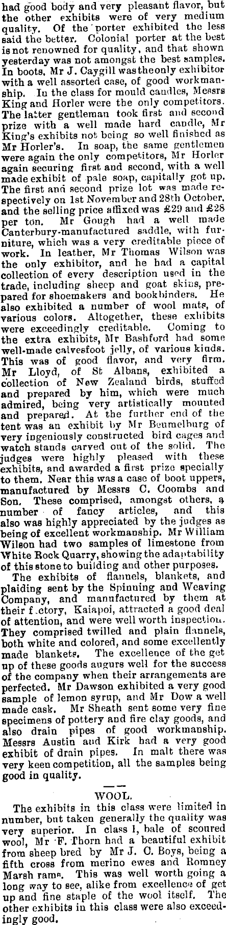 had good body and very pleasant flavor, but the other exhibits were of very medium quality. Of the porter exhibited the less said the better. Colonial porter at the best is not renowned for quality, and that shown yesterday was not amongst the best samples. In boots. Mr J. Caygill wastheonly exhibitor with a well assorted case, of good workmanship. In the class for mould candles, Messrs King and Horler were the only competitors. The latter gentleman took first and second prize with a well made hard candle, Mr King’s exhibits not being so well finished as Mr Horler’s. In soap, the same gentlemen were again the only competitors, Mr Horler again securing first and second, with a well made exhibit of pale soap, capitally got up. The first and second prize lot was made respectively on Ist November and 28th October, and the selling price affixed was £29 and £2B per ton. Mr Gough had a well made Canterbury-manufactured saddle, with furniture, which was a very creditable piece of work. In leather, Mr Thomas Wilson was the only exhibitor, and he had a capital collection of every description used in the trade, including sheep and goat skins, prepared for shoemakers and bookbinders. He also exhibited a number of wool mats, of various colors. Altogether, these exhibits were exceedingly creditable. Coming to the extra exhibits, Mr Bashford had some well-made calvesfoot jelly, of various kinds. This was of good flavor, and very firm. Mr Lloyd, of St Albans, exhibited _ a collection of New Zealand birds, stuffed and prepared by him, which were much admired, being very artistically mounted and prepared. At the further end of the tent was an exhibit by Mr Beumelburg of very ingeniously constructed bird cages and watch stands carved out of the solid. The judges were highly pleased with these exhibits, and awarded a first prize specially to them. Near this was a case of boot uppers, manufactured by Messrs C. Coombs and Son, These comprised, amongst others, a number of fancy articles, and this also was highly appreciated by the judges as being of excellent workmanship. Mr William Wilson had two samples of limestone from White Rock Quarry, showing the adaptability of this stone to building and other purposes. The exhibits of flannels, blankets, and plaiding sent by the Spinning and Weaving Company, and manufactured by them at their f ctory, Kaiapoi, attracted a good deal of attention, and were well worth inspection. They comprised twilled and plain flannels, both white and colored, and some excellently made blankets. The excellence of the get up of these goods augurs well for the success of the company when their arrangements are perfected. Mr Dawson exhibited a very good sample of lemon syrup, and Mr Dow a well made cask. Mr Sheath sent some very fine specimens of pottery and fire clay goods, and also drain pipes of good workmanship. Messrs Austin and Kirk had a very good exhibit of drain pipes. In malt there was very keen competition, all the samples being good in quality. WOOL. The exhibits in this class were limited in number, but taken generally the quality was very superior. In class 1, hale of scoured wool, Mr P. Thorn had a beautiful exhibit from sheep bred by Mr J. 0. Boys, being a fifth cross from merino ewes and Romney Marsh ram". This was well worth going a long way to sec, alike from excellence of get up and fine staple of the wool itself. The other exhibits iu this class were also exceedingly good.