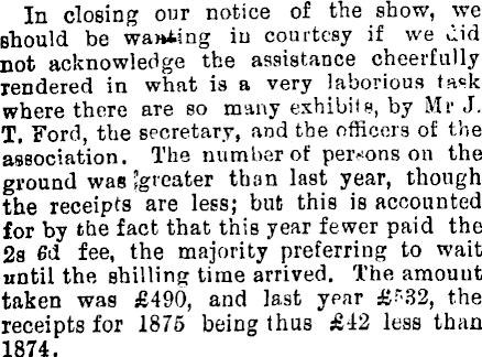 In closing our notice of the show, we should be wanting iu courtesy if we did not acknowledge the assistance cheerfully rendered in what is a very laborious (ask where there are so many exhibits, by Mr J. T. Ford, the secretary, and the officers of the association. The number of persons on the ground was than last year, though the receipts are less; but this is accounted for by the fact that this year fewer paid the 2s 6d fee, the majority preferring to wait until the shilling time arrived. The amount taken was £490, and last year £'B2, the receipts for 1875 being thus £42 less than 1874.