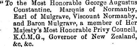 “To the Most Honorable George Augustus Constantine. Marquis of Normanby, Earl of Mulgrave, Viscount Normanby, and Baron Mulgrave, a member of Her Majesty’s Most Honorable Privy Council, K.C.M.G., Governor of New Zealand, &c, &c.