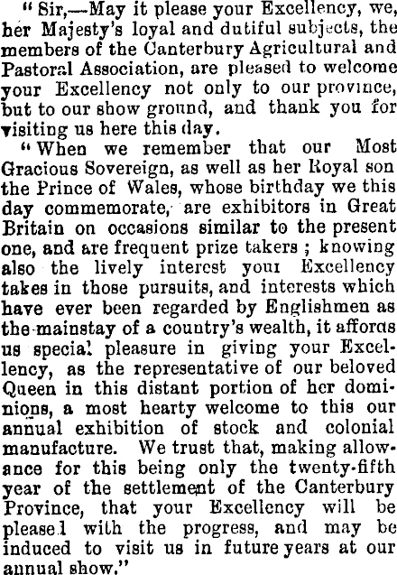 “ Sir, —May it please your Excellency, we, her Majesty’s loyal and dutiful subjects, the members of the Canterbury Agricultural and Pastoral Association, are pleased to welcome your Excellency not only to our province, but to our show ground, and thank you for ■visiting us here this day, “ When we remember that our Most Gracious Sovereign, as well as her Royal son the Prince of Wales, whose birthday we this day commemorate, are exhibitors in Great Britain on occasions similar to the present one, and are frequent prize takers ; knowing also the lively interest youi Excellency takes in those pursuits, and interests which have ever been regarded by Englishmen as the mainstay of a country’s wealth, it affords us special pleasure in giving your Excellency, as the representative of our beloved Queen in this distant portion of her dominions, a most hearty welcome to this our annual exhibition of stock and colonial manufacture. We trust that, making allowance for this being only the twenty-fifth year of the settlement of the Canterbury Province, that your Excellency will be please! with the progress, and may be induced to visit us' in future years at our annual show.”