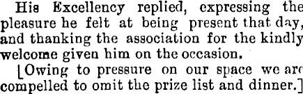 His Excellency replied, expressing the pleasure he felt at being present that day, and thanking the association for the kindly welcome given him on the occasion. [Owing to pressure on our space wo are compelled to omit the prize list and dinner,]