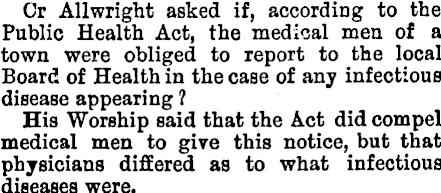 Cr Allwright asked if, according to the Public Health Act, the medical men of a town were obliged to report to the local Board of Health in the case of any infectious disease appearing ? His Worship said that the Act did compel medical men to give this notice, but that physicians differed as to what infectious diseases were.