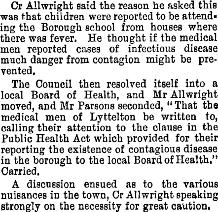 Cr Allwright said the reason he asked this was that children were reported to be attending the Borough school from houses where there was fever. He thought if the medical men reported cases of infectious disease much danger from contagion might be prevented. The Council then resolved itself into a local Board of Health, and Mr Allwright moved, and Mr Parsons seconded, “ That the medical men of Lyttelton be written to, calling their attention to the clause in the Public Health Act which provided for their reporting the existence of contagious disease in the borough to the local Board of Health.” Carried. A discussion ensued as to the various nuisances in the town, Cr Allwright speaking strongly on the necessity for great caution,