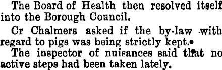 The Board of Health then resolved itself into the Borough Council, Cr Chalmers asked if the by-law with regard to pigs was being strictly kept.* The inspector of nuisances said tlfet no active steps had been taken lately.