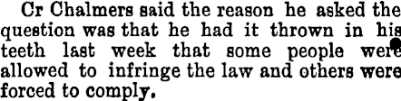 Cr Chalmers said the reason he asked the question was that he had it thrown in his teeth last week that some people well allowed to infringe the law and others were forced to comply.