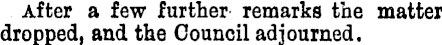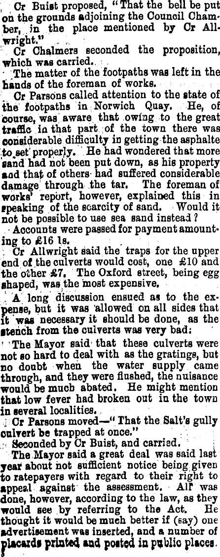 Or Buist proposed, “ That the bell be put on the grounds adjoining the Council Chamber, in the place mentioned by Or Allwright.” Or Chalmers seconded the proposition, which was carried. The matter of the footpaths was left in the bands of the foreman of works. Or Parsons called attention to the state of the footpaths in Norwich Quay. He, of course, was aware that owing to the great traffic in that part of the town there was considerable difficulty in getting the asphalte to set properly. He had wondered that more sand had not been put down, as his property and that of others had suffered considerable damage through the tar. The foreman of works’ report, however, explained this in speaking of the scarcity of sand. Would it not be possible to use sea sand instead ? Accounts were passed for payment amounting to £l6 Is. Cr Allwright said the traps for the upper end of the culverts would cost, one £lO and the other £7, The Oxford street, being egg shaped, was the most expensive. A long discussion ensued as to the expense, but it was allowed on all sides that it wm necessary it should be done, as the ■tench from the culverts was very bad: The Mayor said that these culverts were not so hard to deal with as the gratings, but no doubt when the water supply came through, and they were flushed, the nuisance would be much abated. He might mention that low fever had broken out in the town in several localities. Or Parsons moved—“ That the Salt’s gully culvert be trapped at once.” Seconded by Cr Buist, and carried. The Mayor said a great deal was said last year about not sufficient notice being given to ratepayers with regard to their right to appeal against the assessment. Air was done, however, according to the law, as they would see by referring to the Act. He thought it would be much better if (say) one advertisement was inserted, and a number of placard! printed and posted in public places.