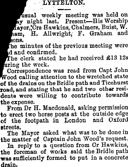 LYTTELTON. weekly meeting was held on night last. Present—His Worship Hawkins, Chalmers, Buist, W. H. Allwright, F. Graham and Hpons. minutes of the previous meeting were and confirmed. clerk stated he had received £l3 12s mring the week. ■ Correspondence was read from Capt John calling attention to the wretched state of the drains on the Bridle path and Ticehurst road, and stating that he and two othar residents were willing to contribute towards the expense. From Dr H. Macdonald, asking permission to erect two horse posts at the outside edge of the footpath in London and Oxford streets. The Mayor asked what was to be done in the matter of Captain John Wood’s request. In reply to a question from Cr Hawkins, the foreman of works said the Bridle path was sufficiently formed to put in a concrete drain.