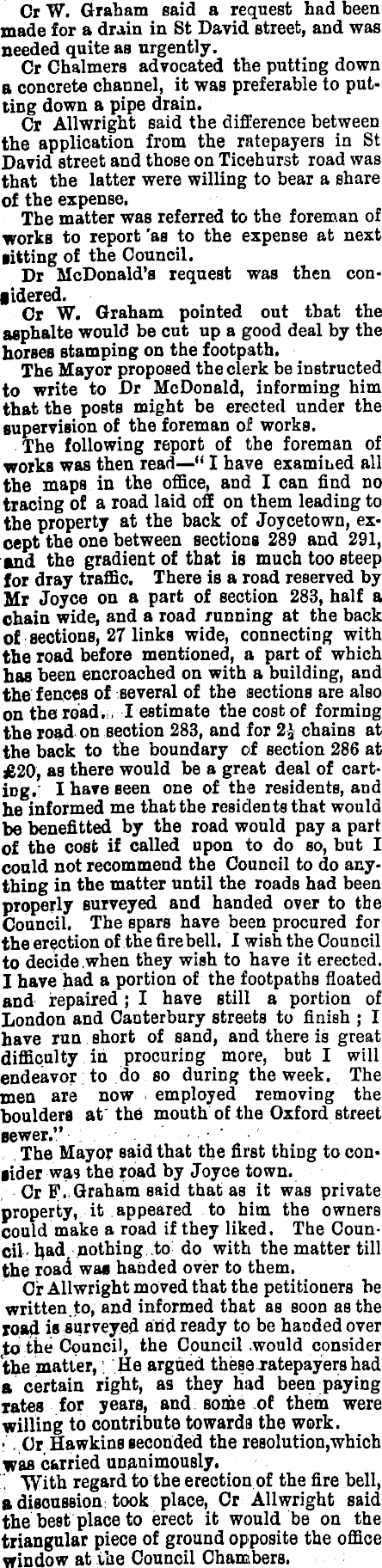 Cr W. Graham said a request had been made for a drain in St David street, and was needed quite as urgently. Or Chalmers advocated the putting down a concrete channel, it was preferable to putting down a pipe drain. Cr Allwright said the difference between the application from the ratepayers in St David street and those on Ticehurst road was that the latter were willing to bear a share of the expense. The matter was referred to the foreman of works to report 'as to the expense at next sitting of the Council. Dr McDonald’s request was then considered. Or W. Graham pointed out that the asphalte would be cut up a good deal by the horses stamping on the footpath. The Mayor proposed the clerk be instructed to write to Dr McDonald, informing him that the posts might be erected under the supervision of the foreman of works. The following report of the foreman of works was then read—“ I have examined all the maps in the office, and I can find no tracing of a road laid off on them leading to the property at the back of Joycetown, except the one between sections 289 and 291, and the gradient of that is much too steep for dray traffic. There is a road reserved by Mr Joyce on a part of section 283, half a chain wide, and a road running at the back of sections, 27 links wide, connecting with the road before mentioned, a part of which has been encroached on with a building, and the fences of several of the sections are also on the road. I estimate the cost of forming the road on section 283, and for 2J chains at the back to the boundary of section 286 at £2O, as there would be a great deal of carting. I have seen one of the residents, and he informed me that the residents that would be benefitted by the road would pay a part of the cost if called upon to do so, but I could not recommend the Council to do anything in the matter until the roads had been properly surveyed and handed over to the Council. The spars have been procured for the erection of the fire bell. I wish the Council to decide when they wish to have it erected. I have had a portion of the footpaths floated and repaired; I have still a portion of London and Canterbury streets to finish ; I have run short of sand, and there is great difficulty in procuring more, but I will endeavor to do so during the week. The men are now employed removing the boulders at the mouth of the Oxford street sewer,” The Mayor said that the first thing to consider was the road by Joyce town. Or F. Graham said that as it was private property, it appeared to him the owners could make a road if they liked. The Council had nothing to do with the matter till the road was handed over to them. Cr Allwright moved that the petitioners he written to, and informed that as soon as the road is surveyed and ready to be handed over to the Council, the Council would consider the matter, He argued these ratepayers had a certain right, as they had been paying rates for years, and some of them were willing to contribute towards the work. Or Hawkins seconded the resolution,which was carried unanimously. With regard to the erection of the fire bell, a discussion took place, Cr Allwright said the best place to erect it would be on the triangular piece of ground opposite the office window at the Council Chambers.