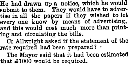 He had drawn up a notice, which he would submit to them. They would have to advertise in all the papers if they wished to let every one know by means of advertising, and this would cost much more than printing and circulating the bills. Or Allwright asked if the statement of the rate required had been prepared ? - The Mayor said that it had been estimated that £IOOO would be required.