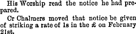 His Worship read the notice he had prepared. Or Chalmers moved that notice be given of striking a rate of Is in the £ on February 21st.