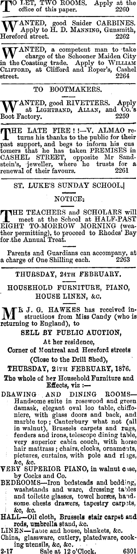 TO LET, TWO BOOMS. Apply at the office of this paper. 2260 WANTED, good Snider CARBINES. Apply to H. D. Manning, Gunsmith, Hereford street. 2262 WANTED, a competent man to take charge of the Schooner Maiden City in the Coasting trade. Apply to William Clifford, at Clifford and Roper’s, Cashel street. 2264 TO BOOTMAKERS. WANTED, good RIVETTERS. Apply at Lightband, Allan, and Co.’s Boot Factory. 2259 THE LATE FIRE I !—V. ALMA© returns his thanks to the public for their past support, and begs to inform his cus tomers that he has taken PREMISES in CASHEL STREET, opposite Mr Sandstein’s, jeweller, where he trusts for a renewal of their favours. 2261 ST. LUKE’S SUNDAY SCHOOL.] NOTICE; THE TEACHERS and SCHOLARS will meet at the School at HALF-PAST EIGHT TO-MORROW MORNING (weather permitting), to proceed to Rhodes’ Bay for .the Annual Treat. Parents and Guardians can accompany, at a charge of One Shilling each. 2263 THURSDAY, 24th FEBRUARY. HOUSEHOLD FURNITURE, PIANO, HOUSE LINEN, &C. MR J. G. HAWKBS has received instructions from Miss Candy (who is returning to England), to SELL BY PUBLIC AUCTION, At her residence, Corner of Montreal and Hereford streets (Close to the Drill Shed), THURSDAY, 2 Ith FEBRUARY, 1876. The whole of her Household Furniture and Effects, viz ; DRAWING AND DINING ROOMS— Handsome suite in rosewood and green damask, elegant oval 100 table, chiffoniere, with glass doors and back, and marble top ; Canterbury what not (all in walnut), Brussels carpets and rugs, fenders and irons, telescope dining table, very superior cabin couch, with horse hair mattrass ; chairs, clocks, ornaments, pictures, curtains, with pole and rings, &C &Ci VERY* SUPERIOR PIANO, in walnut c ise, by Cocks and Co. BEDROOMS—Iron bedsteads and bedding, washstands and ware, dressing tables and toilette glasses, towel horses, handsome. chests drawers, tapestry carpets, &o, &c. HALL—OiI cloth, Brussels stair carpet and rods, umbrella stand, &c. LlNEN—fable and house, blankets, &c. China, glassware, cutlery, platedware, cooking utensils, &c, &c. 2-17 Sale at 12 o’Clock. 6301