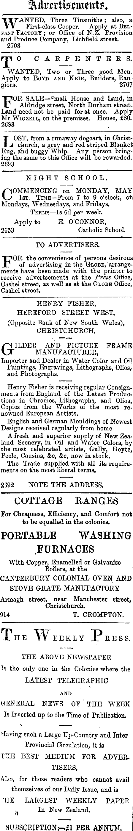 %&vtxtxsmtttU. [RANTED, Three Tinsmiths; also, a First-class Cooper. Apply at Belfast Factory ; or Office of N. Z. Provision and Produce Company, Lichfield street. 2703 10 CARPENTERS. WANTED, Two or Three good Men. Apply to Boyd and Keir, Builders, Ran giora. 2707 OR SALE— s mall House and Land, in 1 Alclridge street, North Durham street. Land need not be paid for at once. Apply Mr Wigzell, on the premises. House, £BO. 2653 OST, from a runaway dogcart, in Christchurch, a grey and red striped Blanket Rug, and buggy Whip. Any person bringing the same to this Office will be rewarded. 2693 NIGHT SCHOOL. COMMENCING on MONDAY, MAY Ist. Time—From 7 to 9 o'clock, oh Mondays, Wednesdays, and Fridays. Terms—ls 6d per week. Apply to E. O'CONNOK, 2653 Catholic School. TO ADVERTISERS. ..OR the convenience of persons desirous ' of advertising in the Globe, arrangements have been made with the printer to receive advertsements at the Press Office, Cashel street, as well as at the Globe Office, Cashel streot. HENRY FISHER, HEREFORD STREET WEST, (Opposite Rank of New South Wales), CHRISTCHURCH. ILDER AND PICTURE FRAME MANUFACTURER, Importer and Dealer in Water Color and Oil Paintings, Engravings, Lithographs, Olios, and Photographs. Henry Fisher is receiving regular Consignments from England of the Latest Productions in Chromos, Lithographs, and Olios, Copies from the Works of the most renowned European Artists. English and German Mouldings of Newest Desigus received regularly from home. A fresh and superior supply of New Zealand Scenery, in Oil and Water Colors, by the most celebrated artists, Gully, Hoyte, Peele, Cousins, &c, &c, now in stock. The Trade supplied with all its requirements on the most liberal terms. 2592 NOTE THE ADDRESS. COTTAGE RANGES For Cheapness, Efficiency, and Comfort not to be equalled in the colonies. PORTABLE WASHING .FURNACES With Copper, Enamelled or Galvanise Boilers, at the CANTERBURY COLONIAL OVEN AND STOVE GRATE MANUFACTORY Armagh street, near Manchester street, Christchurch. 914 T. CROMPTON. The Wee RESS. THE ABOVE NEWSPAPER Is the only one in the Colonies where the LATEST TELEGRAPHIC GENERAL NEWS OF' THE WEEK Is Ir.*erted up to the Time of Publication. Having such a Large Up-Country and Inter Provincial Circulation, it is TTIE BEST MEDIUM FOR ADVERTISERS, Also, for those readers who cannot avail themselves of our Daily Issue, and is i'flE LARGEST WEEKLY PAPER In New Zealand. SUBSCRIPTIONi-rfl PER ANNUM,