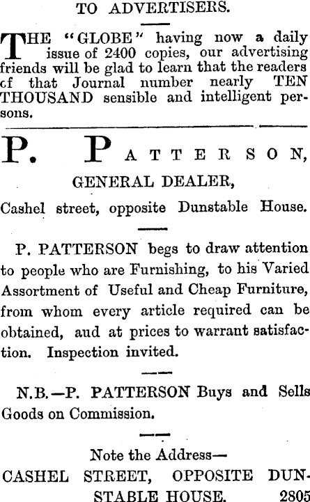 TO ADVERTISERS. THE “GLOBE" having now a daily issue of 2400 copies, our advertising friends will be glad to learn that the readers cf that Journal number nearly TEN THOUSAND sensible and intelligent persons. P, Patterson, GENERAL DEALER, Cashel street, opposite Dunstable House, P. PATTERSON begs to draw attention to people who are Furnishing, to his Varied Assortment of Useful and Cheap Furniture, from whom every article required can be obtained, aud at prices to warrant satisfaction. Inspection invited. N.B.—P. PATTERSON Buys and Sells Goods on Commission. Note the Address — CASHEL STREET, OPPOSITE DUNSTABLE HOUSE. 2805