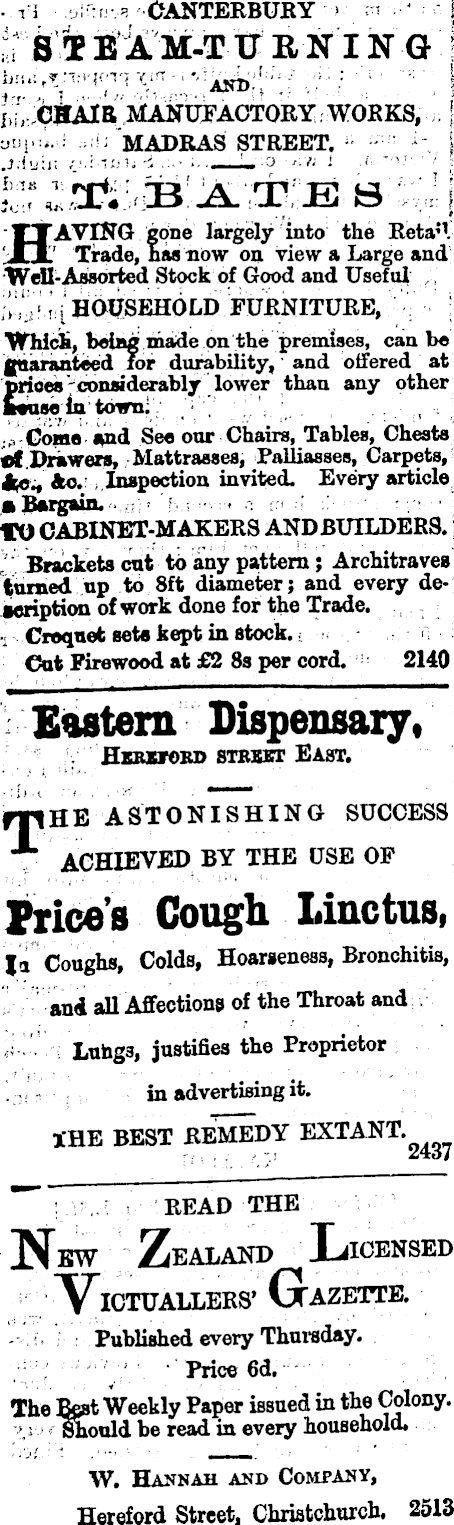 CANTERBURY STEAM-TURNING l CftAlß MANUFACTORY WORKS, MADRAS STREET. tf; B J*7t JE S AVTNG gone largely into the Reta'*. .' Trade, has now on view a Large and Well-Assorted Stock of Good and Useful HOUSEHOLD FURNITURE, Which, being made on the premises, can be guaranteed for durability, and offered at prices considerably lower than any other Muse In town. Gome and See our Chairs, Tables, Chests ef Drawers, Mattrasaes, Palliasses, Carpets, Ac., 40. Inspection invited. Every article a Bargain. IX) CABINET-MAKERS ANDBUILDERS. Brackets cut to any pattern; Architraves turned up to Bft diameter; and every description of work done for the Trade. Croquet seta kept in stock. Cut Firewood at £2 8s per cord. 2140 Eastern Dispensary, HXBSIOBO STREET EAST. |HE ASTONISHING SUCCESS ' ACHIEVED BY THE USE OF Prices Cough Linctus, la Coughs, Colds, Hoarseness, Bronchitis, and all Affections of the Throat and Lung 3, justifies the Proprietor in advertising it. IHE BEST REMEDY EXTANT 2437 READ THE r T ZEALAND ICTUALLERS' G"AZETTE. Published every Thursday. Price 6d. The Best Weekly Paper issued in the Colony. Should be read in every household. W. Hannah and Company, Hereford Street. Christchurch. 2513
