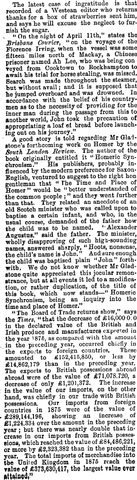 The latest case of ingratitude is that recorded of a Westean editor who returns thanks for a box of strawberries sent him, and says he will excuse the neglect to furnish the sugar. “On the night of April 11th,” states the Brisbane Courier, “on the voyage of the Florence Irving, when the vessel was some fifteen miles north of Mackay, a Chinese prisoner named Ah Lee, who was being con yeyed from Cooktown to Bockhampton to await his trial for horse stealing, was missed. Search was made throughout the steamer, but without avail; and it is supposed that he jumped overboard and was drowned. In accordance with the belief of his countrymen as to the necessity of providing for the inner man during the passage from this to another world, John took the precaution of appropriating a loaf of bread before launching out on his journey.” „ A good story is told regarding Mr Gladstone’s forthcoming work on Homer by the South London Review. The author of the book originally entitled it “Homeric Synchronism.” His publishers, probably influenced by the modern preference for SaxonEnglish, ventured to suggest to the right hon gentleman that “ The Time and Place of Homer ” would be “ better understauded of the Common people ; ” and they went further than that. They related an anecdote of an old Scotch minister who was called upon to baptise a certain infant, and who, in the usual course, demanded of the fataer how the child was to be named. ‘ Alexander Augustus.” said the father. The minister, wholly disapproving of such higa-sounding names, answered sharply, “ Hoots, nonsense, the child’s name is John. ” And sure enough the child was baptised plain “John” forthwith. We do not know whether Mr Gladstone quite appreciated this jocular remonstrance, but at all events it led to a modification, or rather duplication, of the title of this book, which now stands—“ Homeric Synchronism, being an inquiry into the time and place of Homer.” “ The Board of Trade returns show,” says the Times , “that the decrease of £16,000 0.0 in the declared value of the British and Irish produce and manufactures exported in the year '876, as compared with the amount in the preceding year, occurred chiefly in the expo-ts to foreign countries. These amounted to £152,415,850, or less by £14,862,179 than in the preceding year. The exports to British possessions abroad abroad were of the value of £71,078.720, a decrease of only £1,201,872. The increase in the value of our imports, on the other hand, was chiefly in our trade with British possessions. Our imports from foreign countries in 1875 were of the value of £289,144,196, showing an increase of £1,224,334 over the amount in the preceding year ; but there was nearly double that increase in our imports from British possessions, which reached the value of £84,486,221, or more by £2,323,382 than in the preceding year. The total imports of merchandise into the United Kingdom in 1875 reach the value of £373,630,417, the largest value ever