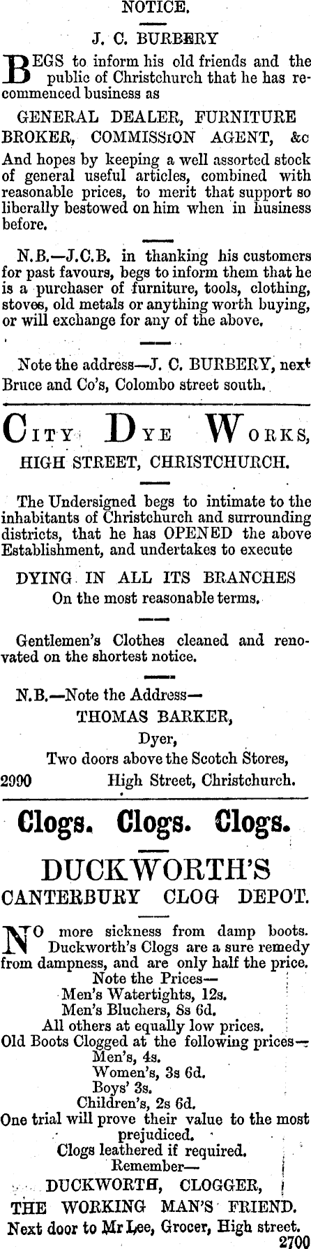 NOTICE. J. C. BERBERY BEGS to inform his old friends and the public of Christchurch that he has recommenced business as GENERAL DEALER, FURNITURE BROKER, COMMISSION AGENT, &c And hopes by keeping a well assorted stock of general useful articles, combined with reasonable prices, to merit that support so liberally bestowed on him when in business before. N.B. —J.C.B, in thanking his customers for past favours, begs to inform them that he is a purchaser of furniture, tools, clothing, stoves, old metals or anything worth buying, or will exchange for any of the above. Note the address—J. C. BURBERY, next Bruce and Co’s, Colombo street south. City Dye Works, HIGH STREET, CHRISTCHURCH. The Undersigned begs to intimate to the inhabitants of Christchurch and surrounding districts, that he has OPENED the above Establishment, and undertakes to execute DYING IN ALL ITS BRANCHES On the most reasonable terms. Gentlemen’s Clothes cleaned and renovated on the shortest notice. N.B.—Note the Address— THOMAS BARKER, Dyer, Two doors above the Scotch Stores, 2990 High Street, Christchurch. Clogs. Clogs. Clogs. DUCKWORTH’S CANTEUBUHY CLOG DEPOT. 0 more sickness from damp boots. JL i Duckworth’s Clogs are a sure remedy from dampness, and are only half the price. Note the Prices— Men’s Watertights, 12s. Men’s Bluchers, 8s 6d. All others at equally low prices. Old Boots Clogged at the following prices— Men’s, 4s, Women’s, 3s 6d, Boys’ 3s. Children’s, 2s 6d. One trial will prove their value to the most prejudiced. Clogs leathered if required. Remember— DUCKWORTH, CLOGGER, i THE WORKING MAN’S FRIEND. Next door to Mrlyee, Grocer, High street. 2700