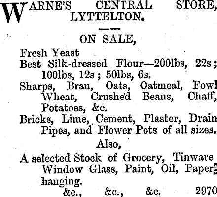 ARNE’S CENTRAL STORE, LYTTELTON. ON SALE, Fresh. Yeast Best Silk-dressed Flour—2oolbs, 225; lOOlbs, 12s ; 501bs, 6s. Sharps, Bran, Oats, Oatmeal, Fowl Wheat, Crushed Beans, Chaff, Potatoes, &c. Bricks, Lime,. Cement, Plaster, Drain Pipes, and Flower Pots of all sizes. Also, A selected Stock of Grocery, Tinware Window Glass, Paint, Oil, Paper?