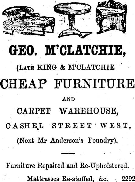 GEO. M’CLATCHIE, {Latb KING & M’CLATCHIE CHEAP FURNITURE AND CAEPET WAEEHOUSE, OASHE,L STREET WEST, (Next Mr Anderson’s Foundry). Furniture Repaired and Re-Upholstered. Mattrasses Re-stuffed, &c. . 2292