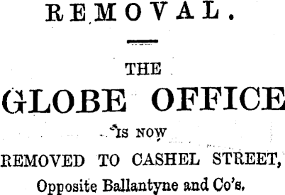 CtLOJBE office '■is NOW REMOVED TO CASHEL STREET, Opposite Ballantyne and Go’s,